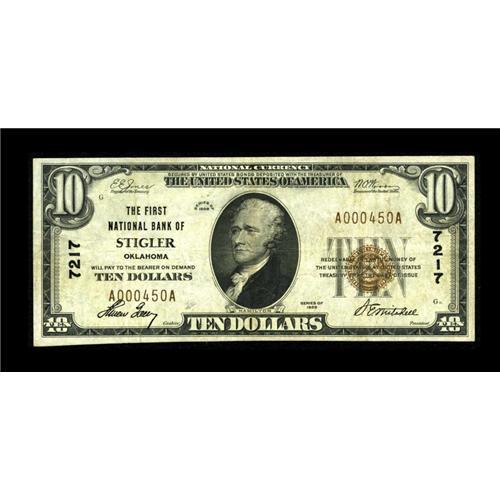 <B>Stigler, OK</B></I> - $10 1929 Ty. 1 <B>The First NB</B></I> Ch. # 7217<BR>A nice evenly circulated piece which is the finest example known from this very scarce Haskell County community. <B>Very Fine.</B></I><BR><I>From The Rolling Plains Collection</B></I><BR><BR><b>Shipping:</b> Coins & Currency (<a target="_blank" href="http://www.heritageauctions.com/common/shipping.php">view shipping information</a>)