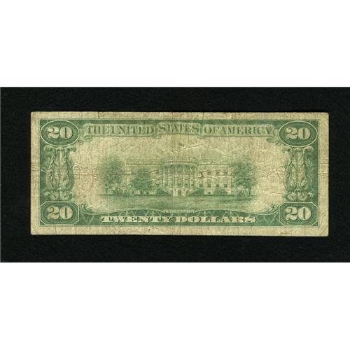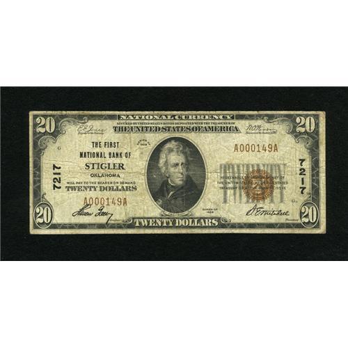 <B>Stigler, OK</B></I> - $20 1929 Ty. 1 <B>The First NB</B></I> Ch. # 7217<BR>No other representatives from this bank have been offered at auction in over two years. It's been nearly three years since the one and only small size issue to appear at auction was sold. The paper is solid, save for a lone pinhole. <B>Very Good.</B></I><BR><BR><b>Shipping:</b> Coins & Currency (<a target="_blank" href="http://www.heritageauctions.com/common/shipping.php">view shipping information</a>)