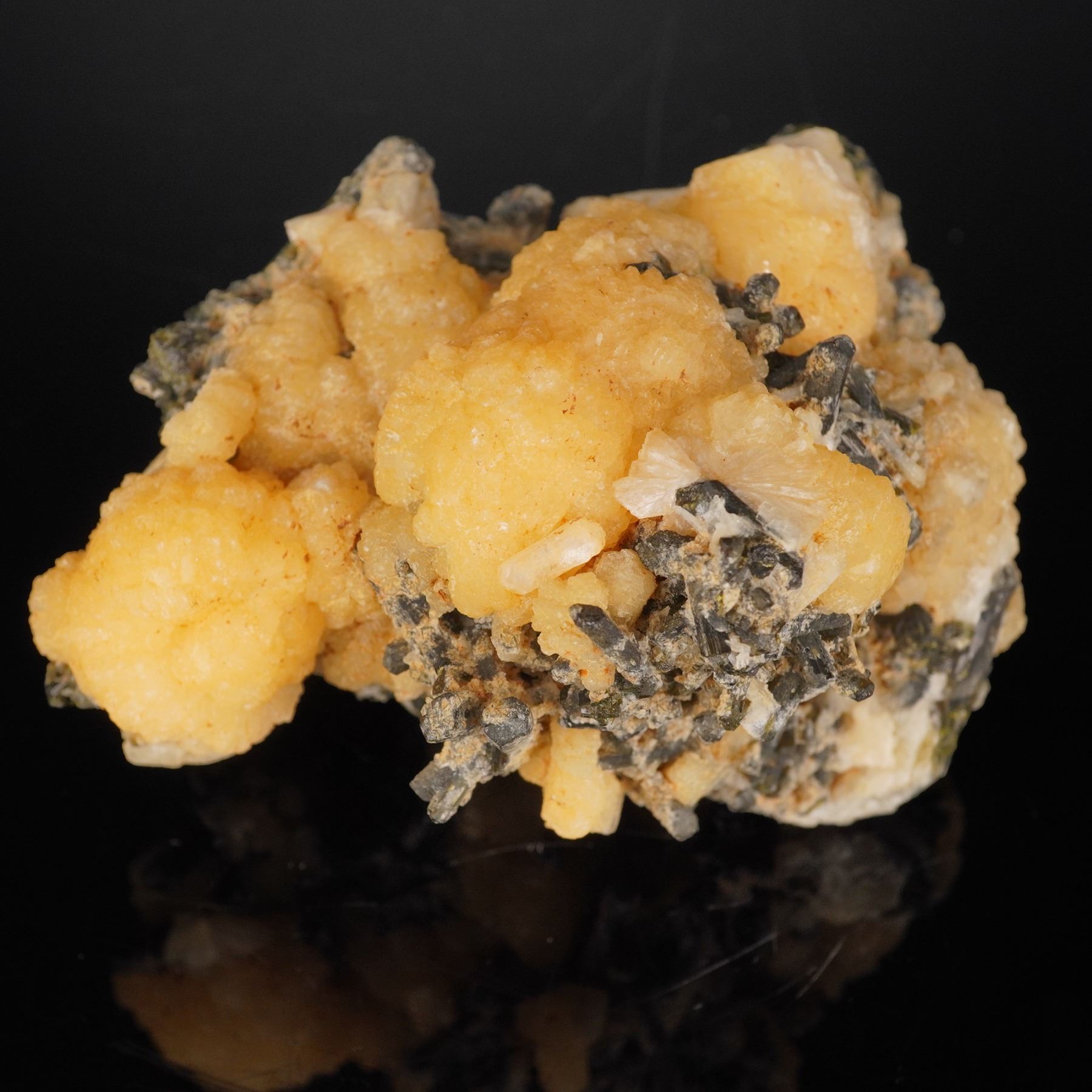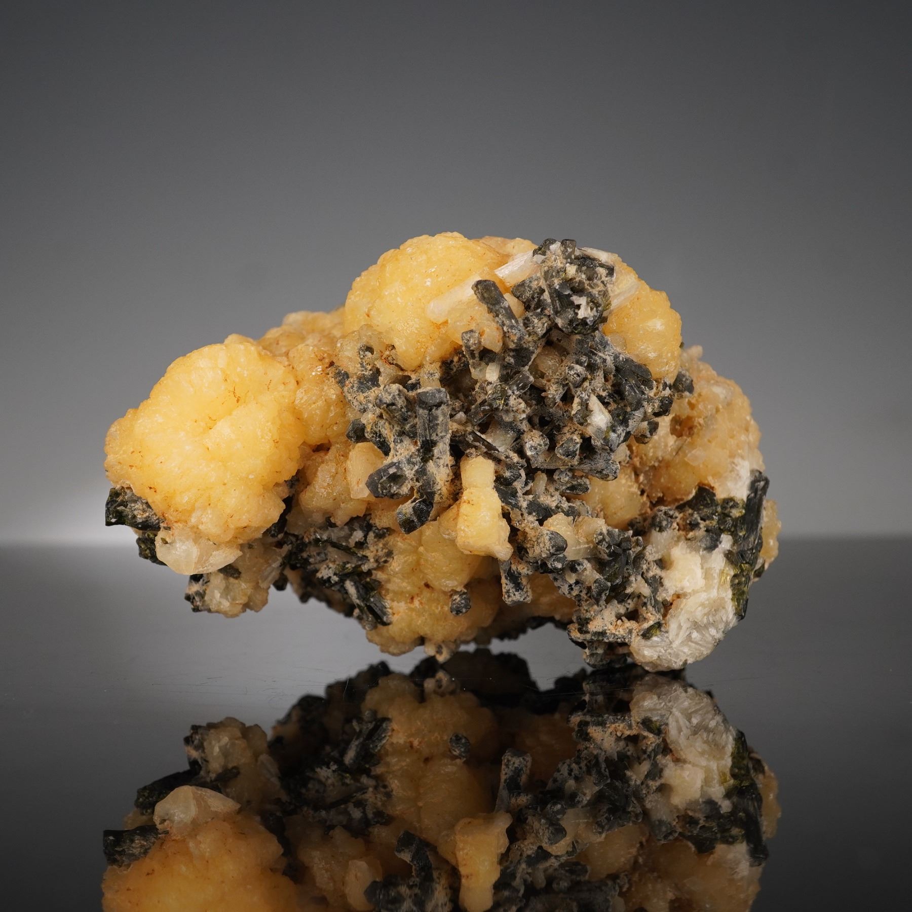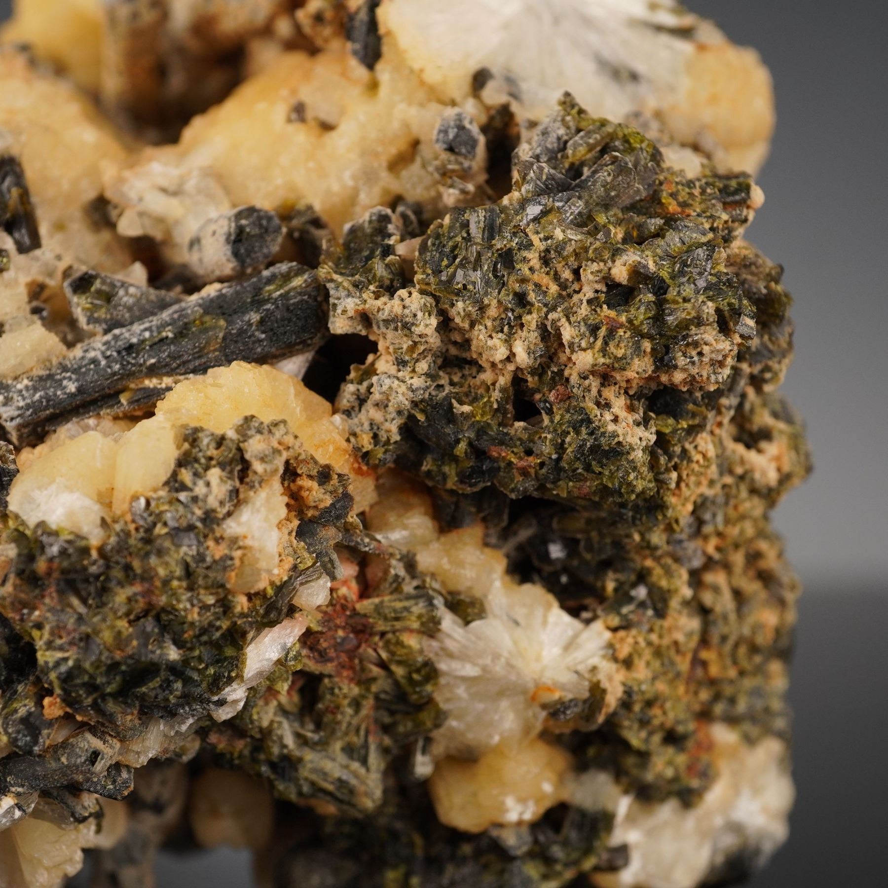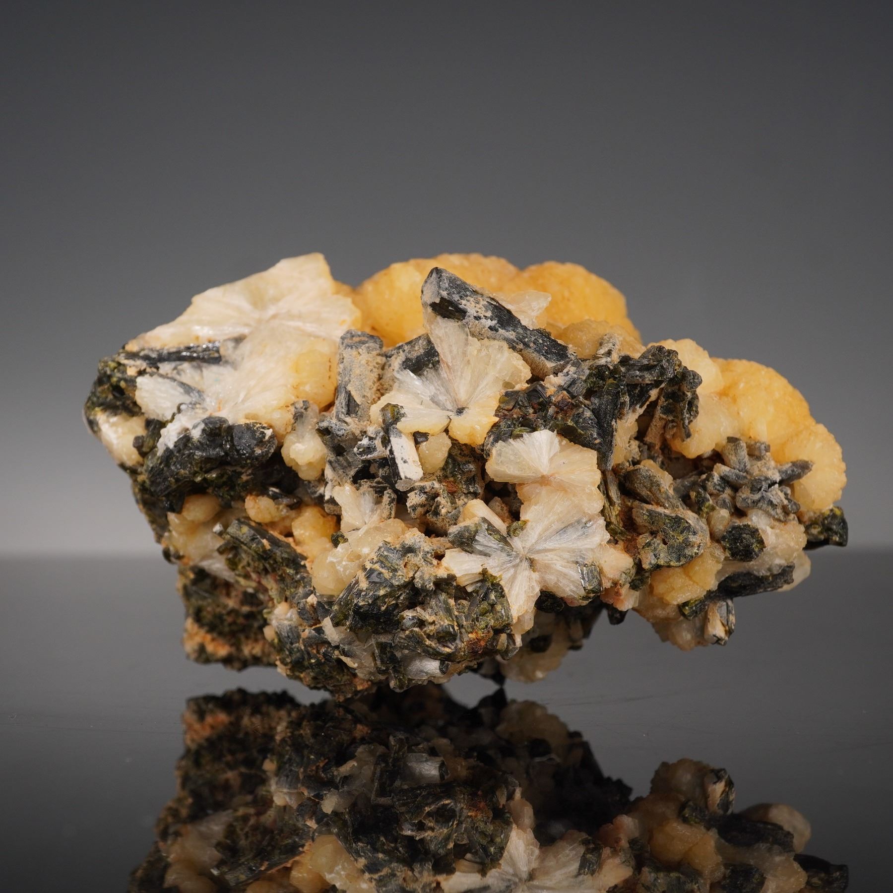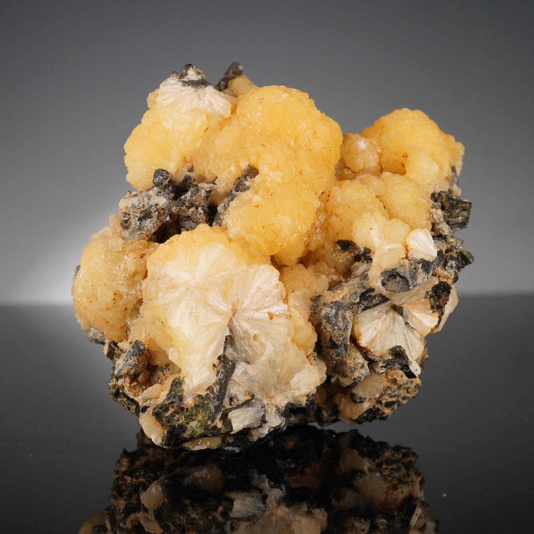 A striking mineral specimen showcasing a dynamic contrast of golden-yellow stilbite crystals nestled among dark greenish-black epidote formations. The radiating stilbite clusters form globular aggregates with a soft, lustrous surface that beautifully complements the sharp, prismatic epidote crystals beneath. This exquisite piece exhibits both vibrant color and complex texture, with occasional translucent stilbite blades adding dimensional brilliance. Collected from the famed deposits of Mali, this specimen captures the elegance and geological artistry of the region's mineral treasures. A stunning addition for collectors drawn to unique color pairings and structural harmony in natural mineral formations.