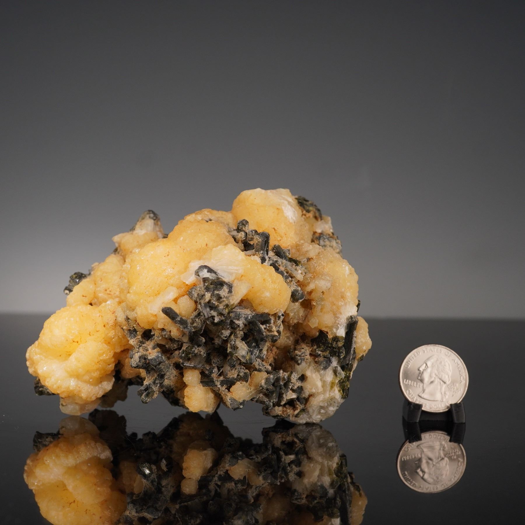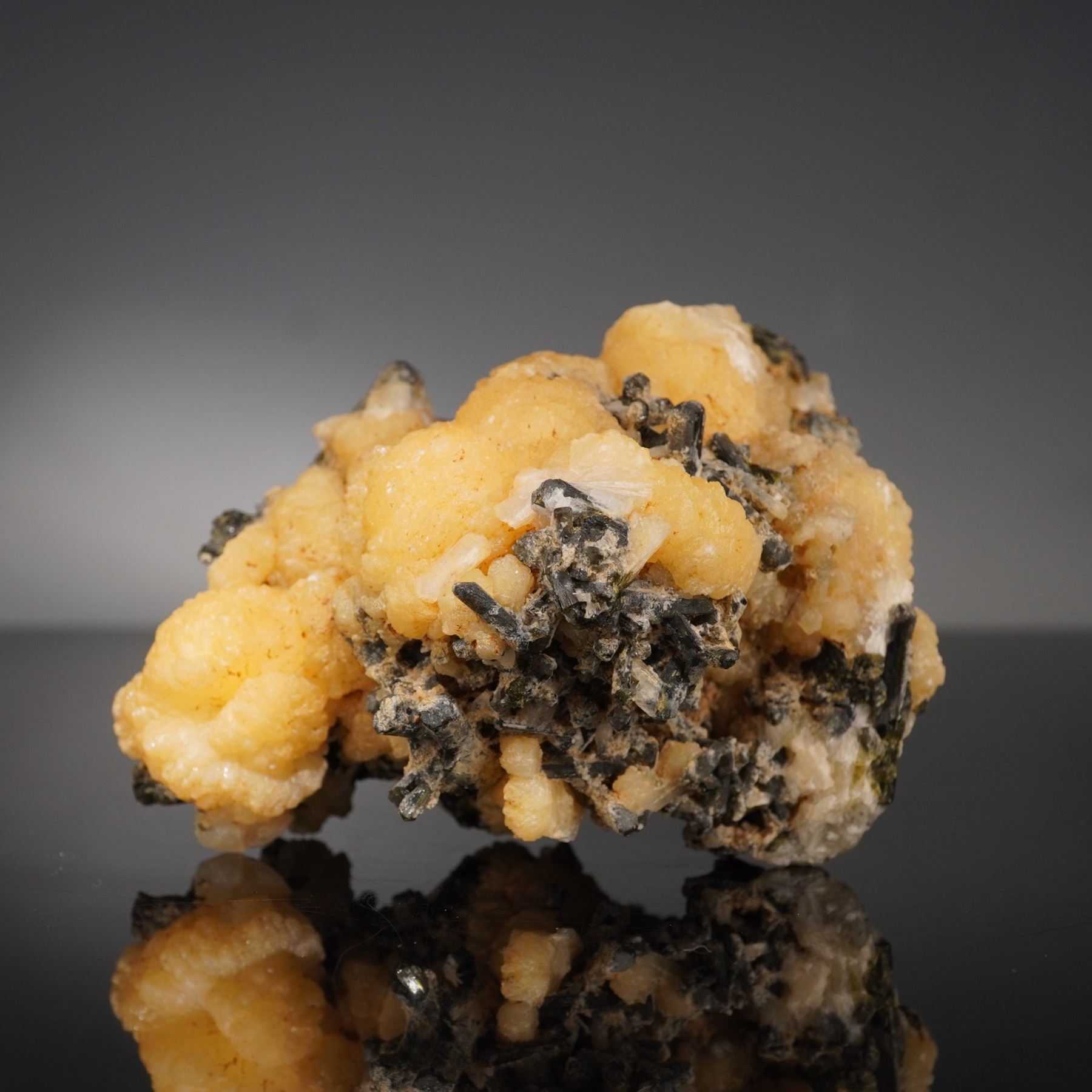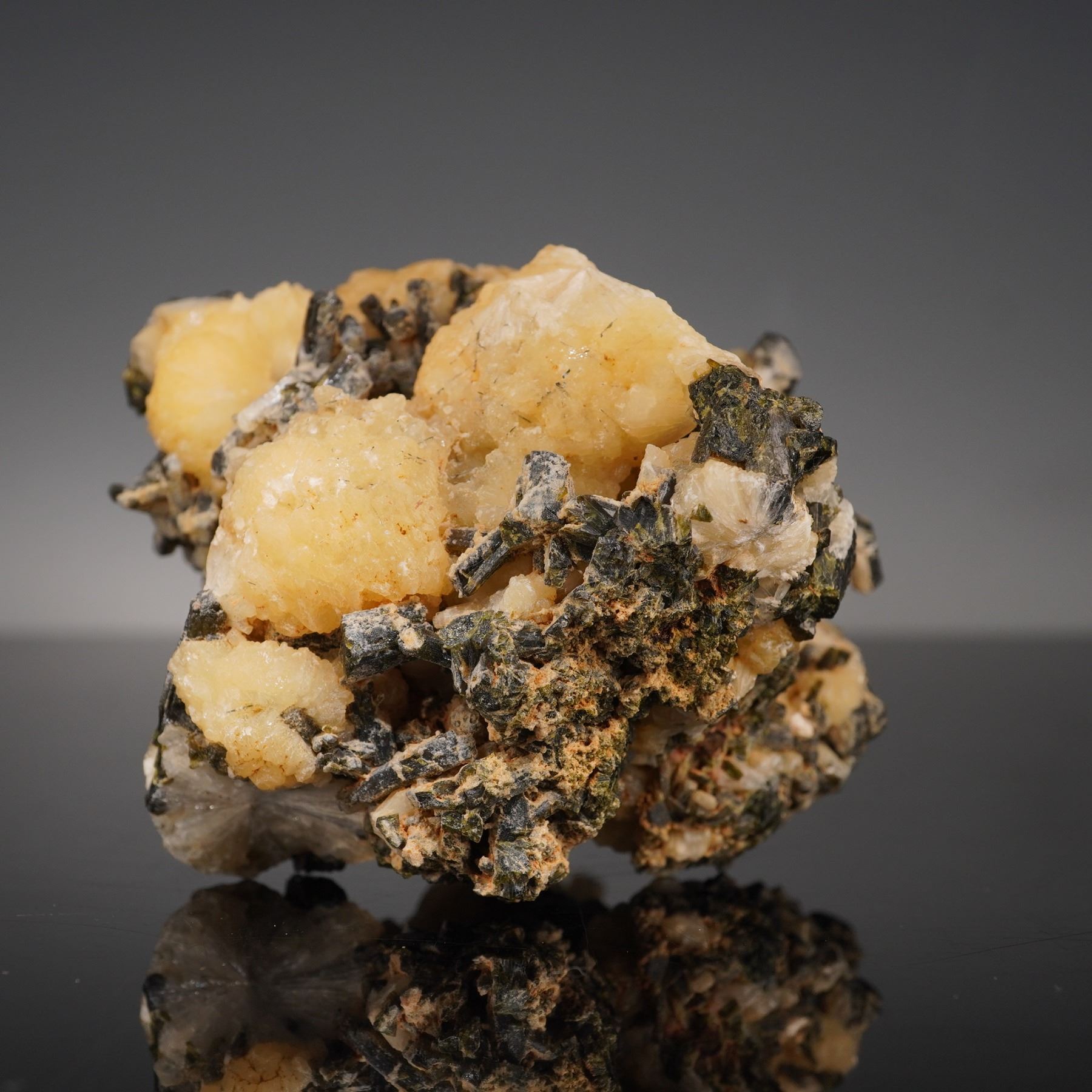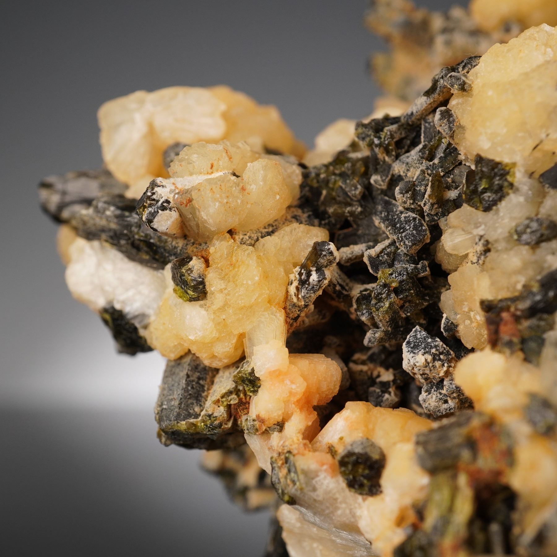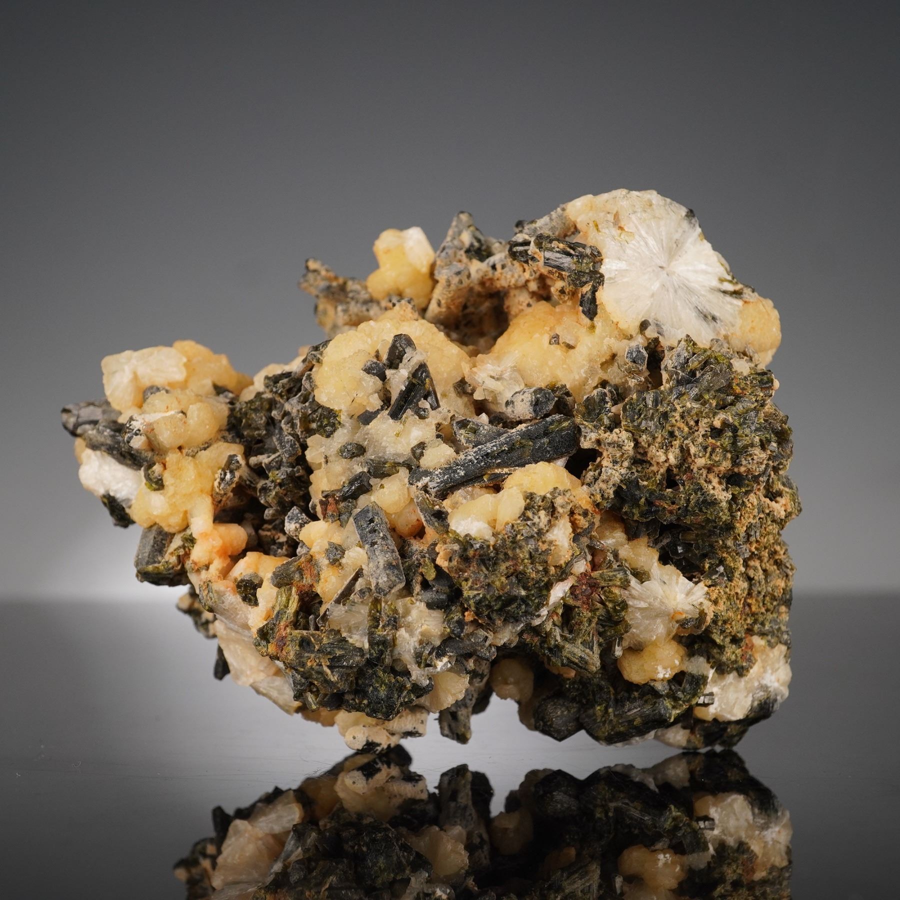 A striking mineral specimen showcasing a dynamic contrast of golden-yellow stilbite crystals nestled among dark greenish-black epidote formations. The radiating stilbite clusters form globular aggregates with a soft, lustrous surface that beautifully complements the sharp, prismatic epidote crystals beneath. This exquisite piece exhibits both vibrant color and complex texture, with occasional translucent stilbite blades adding dimensional brilliance. Collected from the famed deposits of Mali, this specimen captures the elegance and geological artistry of the region's mineral treasures. A stunning addition for collectors drawn to unique color pairings and structural harmony in natural mineral formations.