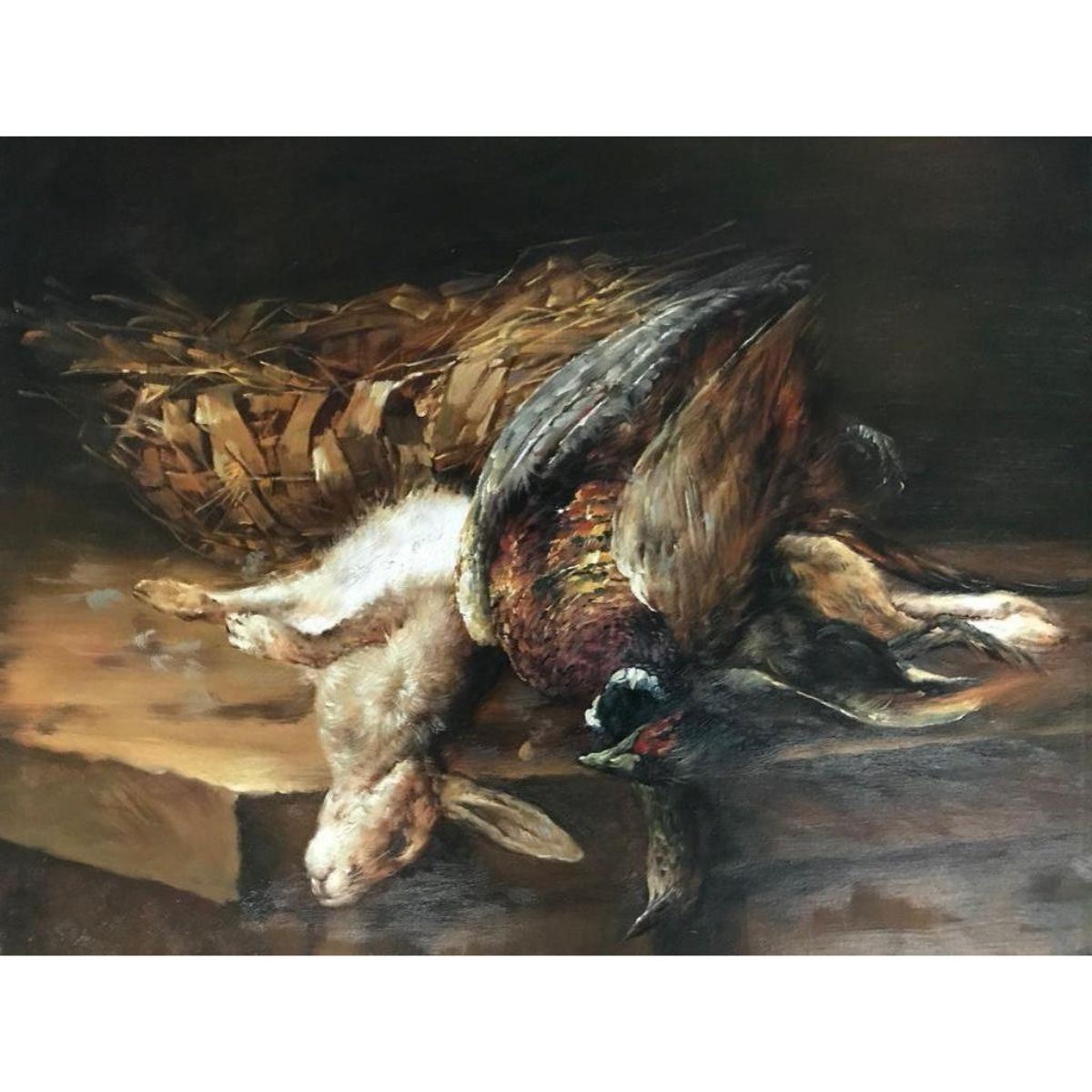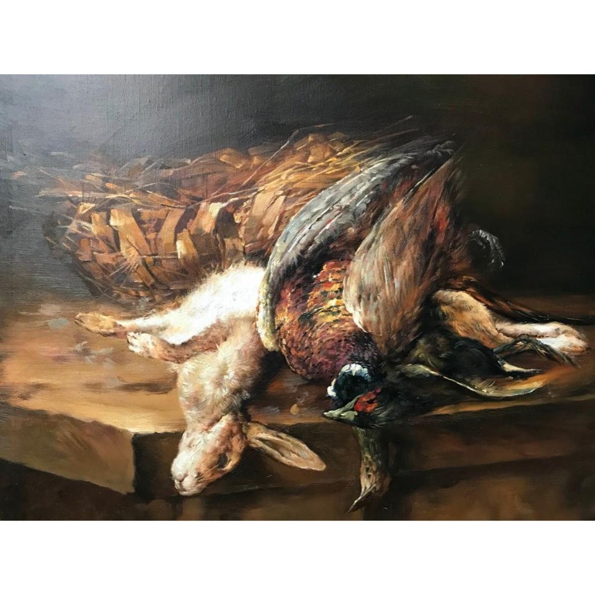 Oil on canvas still life, hunting theme, After the Hunt, rabbit & pheasant on a table. 20" X 24" stretched, unframed, unsigned canvas.