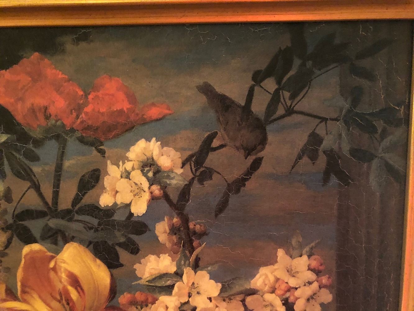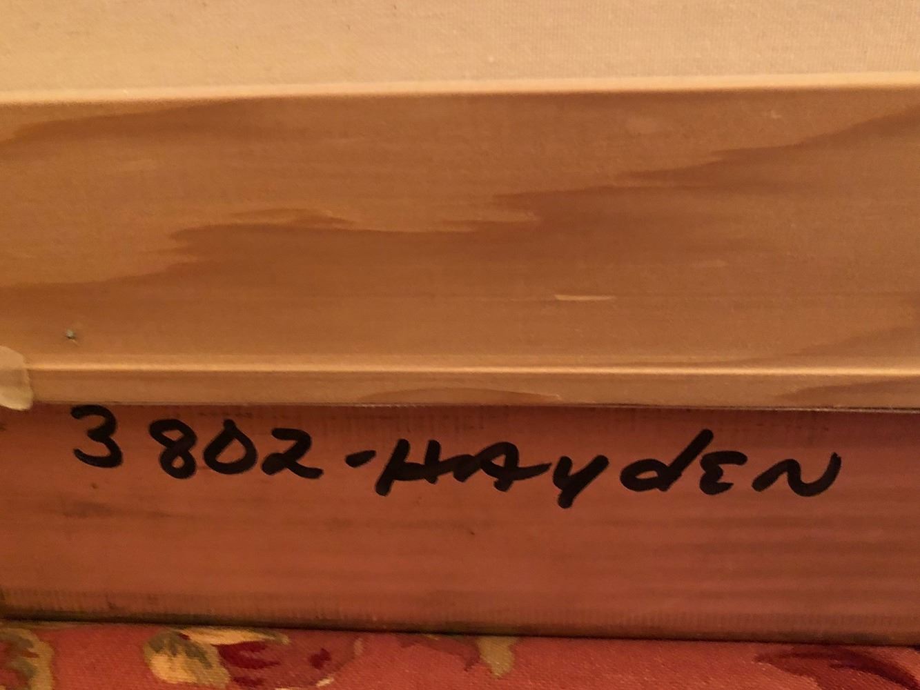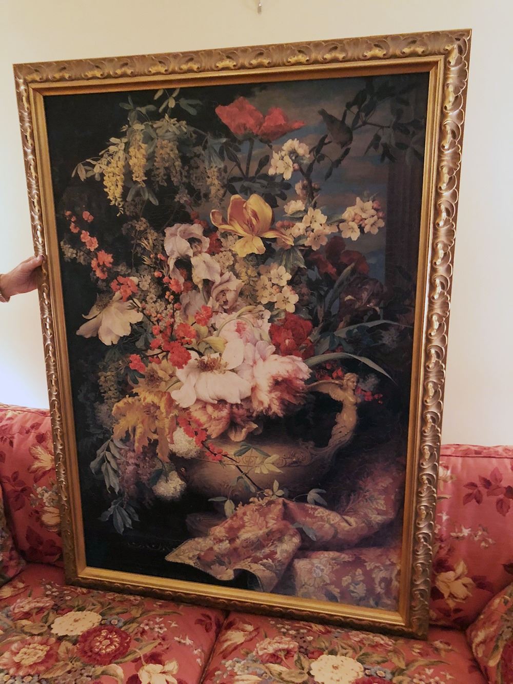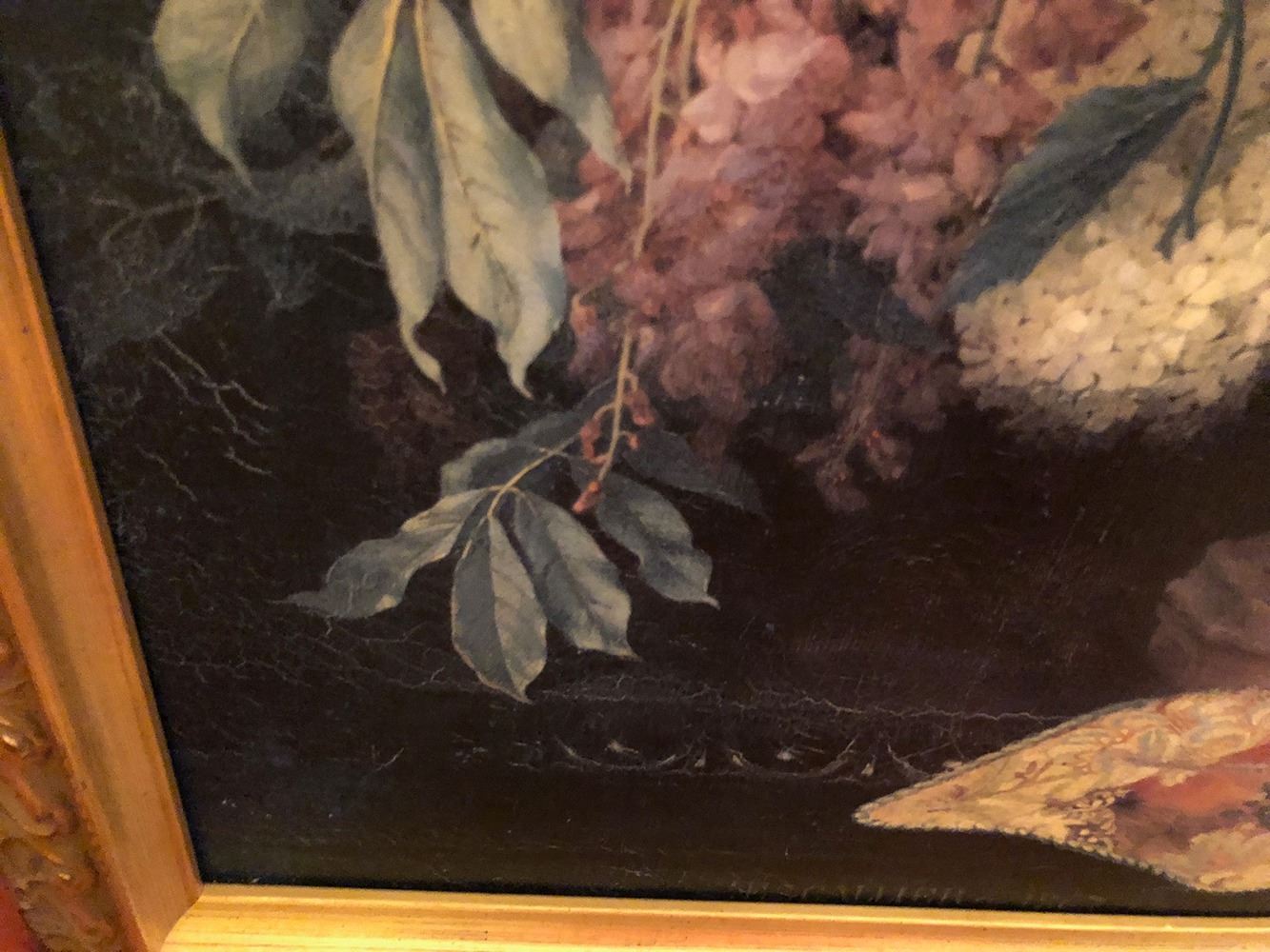 Decorative still life oil painting on canvas, beautiful floral arrangement in gold gilt frame.Marked “Hayden” on back of frame, frame size measures approx. 54.5” tall x 38.25” wide.