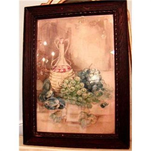 Lovely original watercolor on paper, still life with an Italian bottle of wine and grapes. Very well done. Excellent condition, no foxing or staining. In original wavy glass and oak frame. Signed LLM 06 (dating it to 1906). Art size measures 14.25"H x 10.25"W. Charming!!
