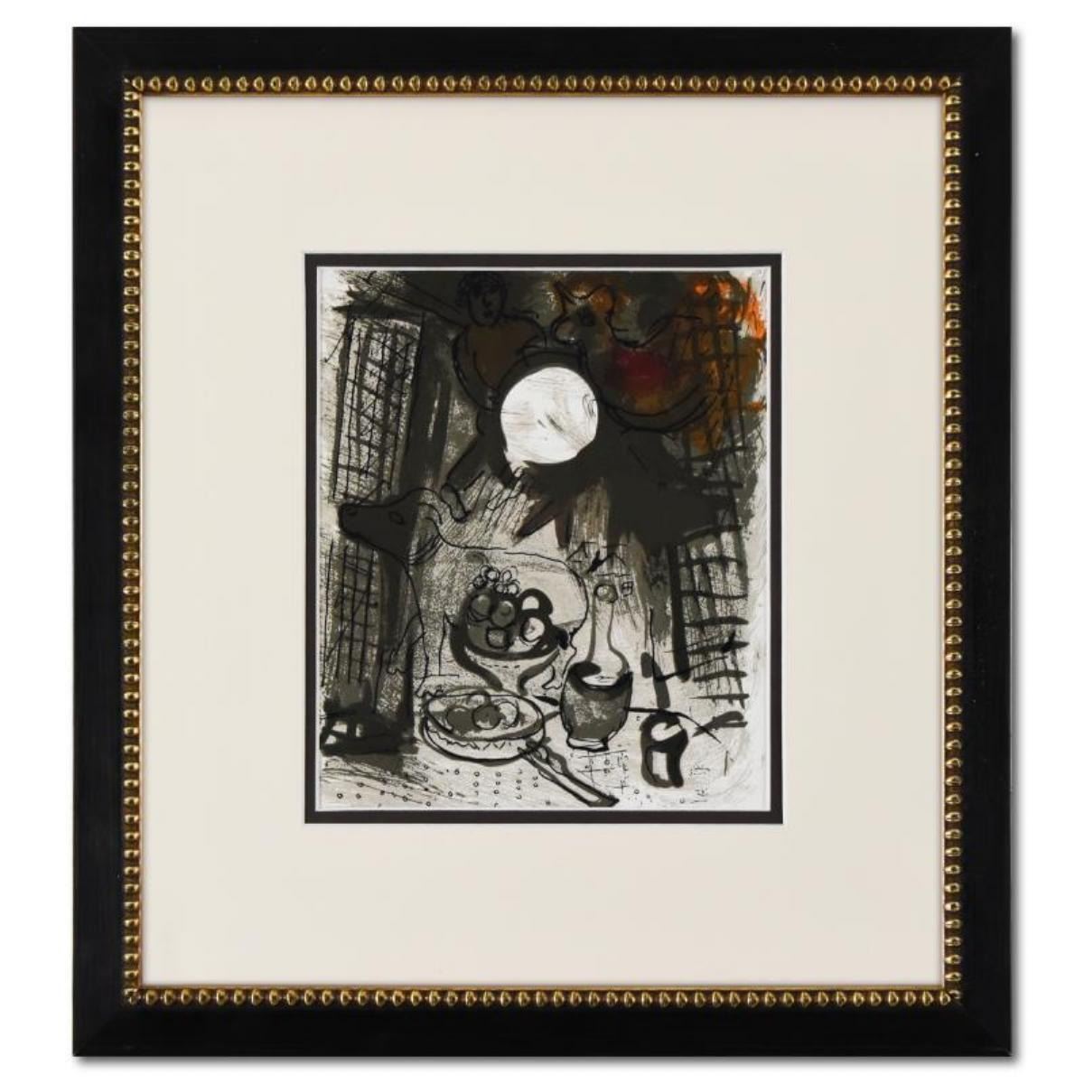 "In Front of the Picture" is a lithograph on paper by Marc Chagall (1887-1985). This piece comes framed. Includes Letter of Authenticity. Measures approx. 15" x 17" (frame), 8" x 9" (image).