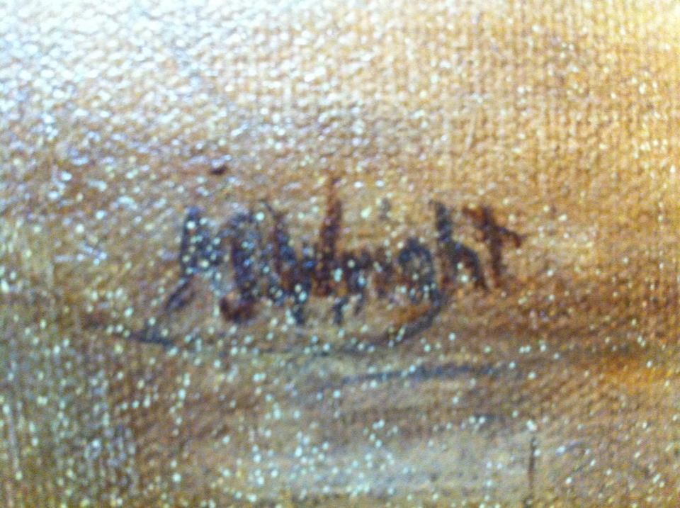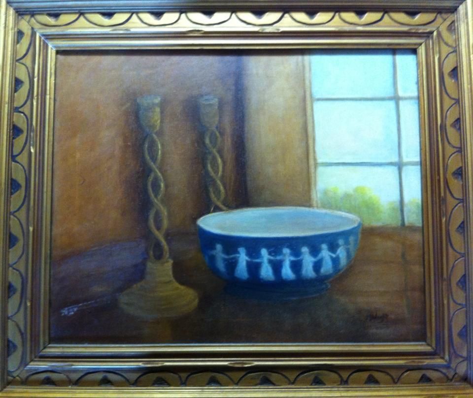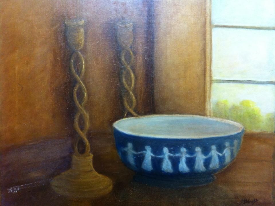 "Still Life" Oil on Canvas. Signed by artist: M. Wright. Framed: 26 1/2" x 22 1/2". Please note that this art piece has a light scratch on the lower left corner.