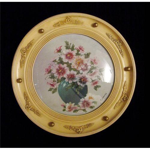 Floral still-life painting in a Regency / Federal style round frame with a convex glass. It signed on lower right E. Bowers, possibly Edward Bowers (1822-1870) a portrait, genre, and still-life painter born in Maryland. In good used condition as shown. Please ask questions, request additional photos and shipping costs before buying. Measurements: Frame: 20" diameter; Image: 13.5" approximately. Weight: 6.6 lbs. (3.01 Kgs.)