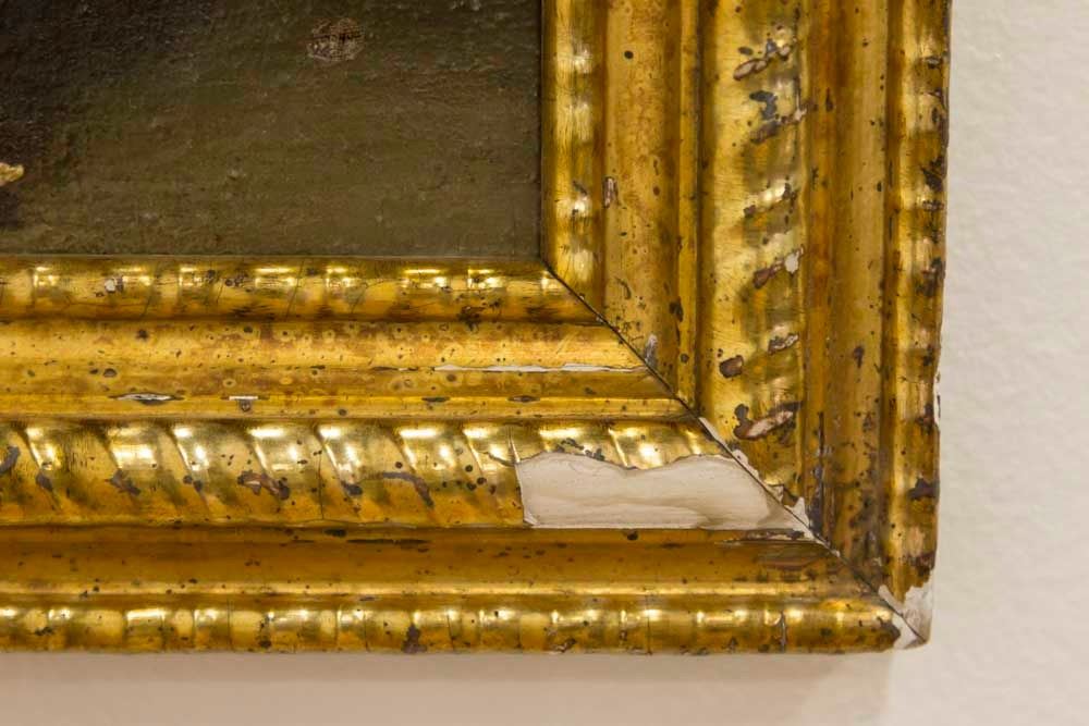 Oil on canvas. 19th century, possibly earlier. Approx. 20" H x 14" W sight, 24" H x 18" W framed. Damage to frame.