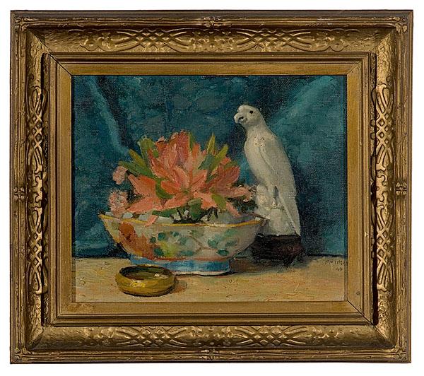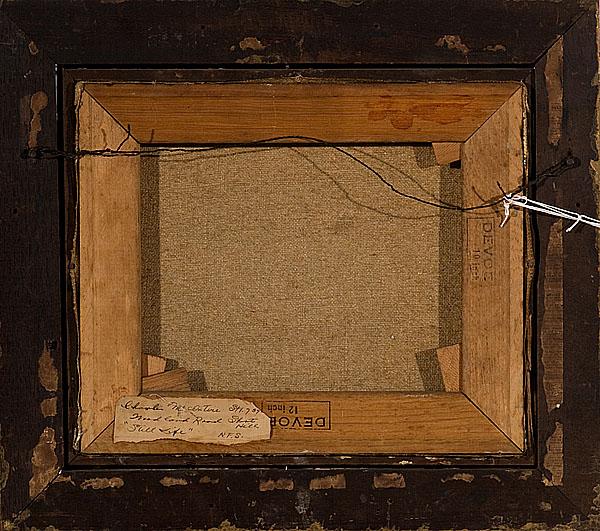 American, 20th century, oil on canvas, signed and dated 40 lower right. Titled Still Life and artist identified on paper label on verso, in a gesso Art Nouveau frame; 9.5" high x 11.5" wide (sight).