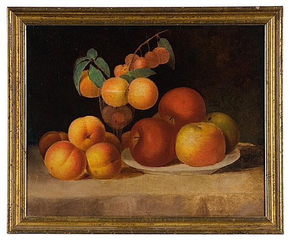 American School, 19th century, oil on canvas. Depicting a branch of cherries, apples and ripe peaches heaped on a table. Unsigned. In a period lemon gilt frame; 16" high x 20" wide (sight).
