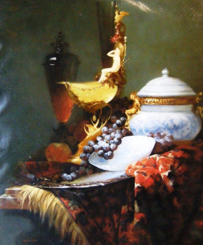 Still Life with Grapes - lg (24) by Yuri Bakruschev a framed original oil on canvas shows a beautiful display of fruit. The framed size is 34" x 30".