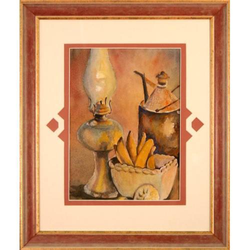 Olive M. Rowland captures a soft moment by lamp-light in her inviting watercolor painting entitled, ?Still Life with Lamp.? Rich earth tones and warm neutrals radiate the delicate glow of the lamp. Subtle shadows are cast throughout the composition to emphasize the three-dimensionality of the tea kettle and bowl of bananas as they are thrust into the foreground. The quiet country atmosphere created by the muted colors and loose rendering of the objects is further emphasized by the incised double mauve and cream mats which surround the piece. These highly unique specialty cuts provide a charming border for the painting with its graphic accents drawing the eye out of the composition and around the stunning frame. The mauve distressed wooden frame, trimmed with gold, pulls the rich earth tones from the center of the composition outward creating a timeless and captivating piece of art. With the frame, this piece measures 16?x20.? Any room would be instantly warmed by the presence of this painting, and priced at such a bargain it is an addition worth aquiring.