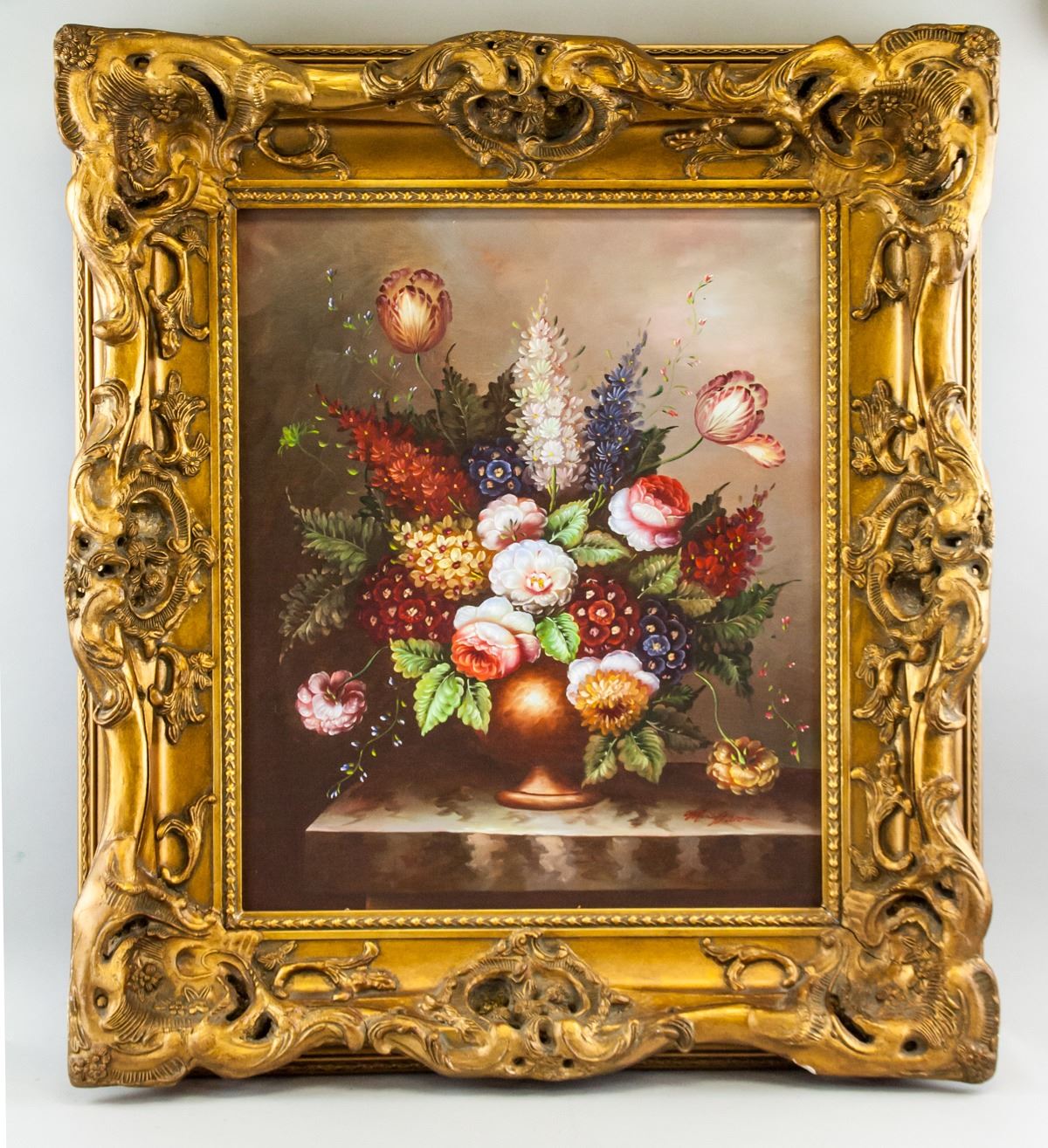 Acrylic on canvas, framed. Featuring a still-life vase bursting with colorful flowers. Signed "M. Aaron" in the bottom right corner. Sticker affixed to verso reads "ART. NO. P1601A SIZE 20X24". 61 x 51 cm (24 x 20 in), Frame: 88 x 77 cm (35 x 30.5 in)