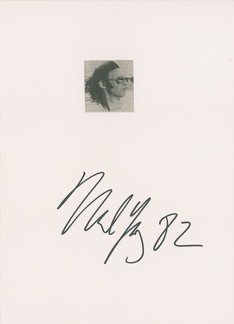Felt tip signature, “Neil Young 82,” on a white 8.25 x 11.25 heavy sheet and felt tip signatures of Graham Nash and Stephen Stills on individual white 5.75 x 4 cards. Two also bear small clipped photos. In fine condition.