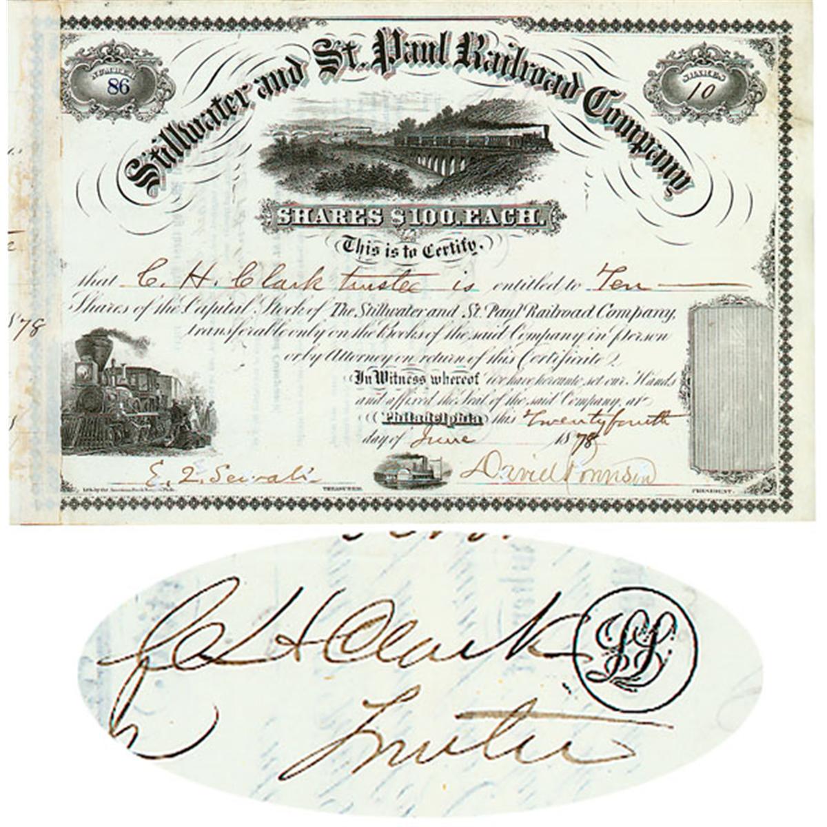 1878, Minnesota. Stock certificate for 10 shares. Issued to and signed on verso by C.H. Clark. Black. Nice panoramic vignette of a steam locomotive crossing a bridge at center, smaller locomotive at lower left. Litho. Punch cancelled and very fine.