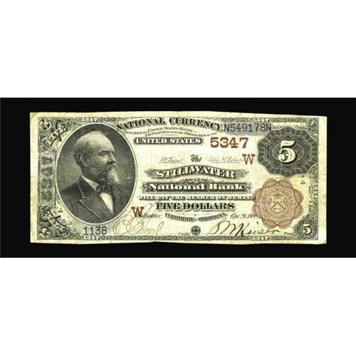 <B>Stillwater, OK</B></I> - $5 1882 Brown Back Fr. 477 <B>The Stillwater NB</B></I> Ch. # (W)5347<BR>This attractive Brown Back is one of six Territorial examples known from here. It is an evenly circulated piece which is utterly problem free and totally solid for the grade. The colors are strong, the margins more than ample, and the pen signatures bold. It is in fact the perfect specimen for the collector who wishes to own a Territorial example but does not want to break the bank in obtaining it. Sharp <B>Fine+++,</B></I> likely to see bidding reach well into the range of...