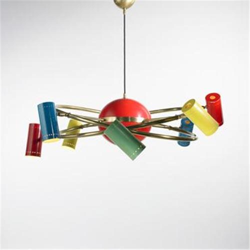 Stilnovo<BR>chandelier<BR>Italy, c. 1950<BR>enameled aluminum, brass<BR>32 dia x 29 h inches<BR><BR>Condition of the item is not included in this description. Condition reports are available from Wright upon request. Wright strongly recommends that you review a condition report for each item on which you plan to bid.