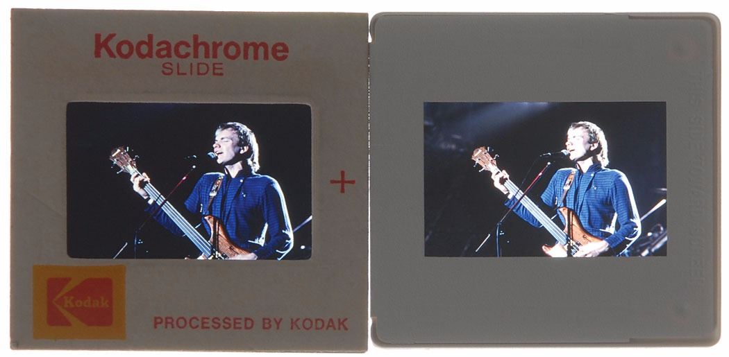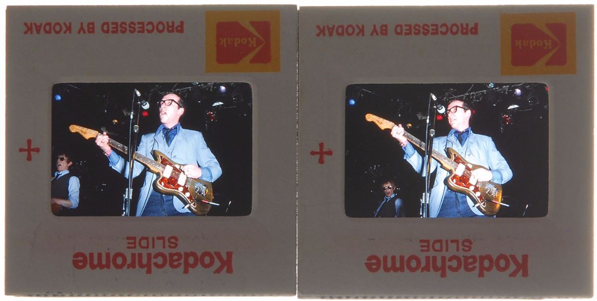 Collection of five color 35mm slides by Richard Creamer: two of Sting during a performance; one of a young Tom Petty playing guitar and singing; and two of Elvis Costello playing his guitar. In overall fine condition. Provenance: Richard Creamer Estate.
