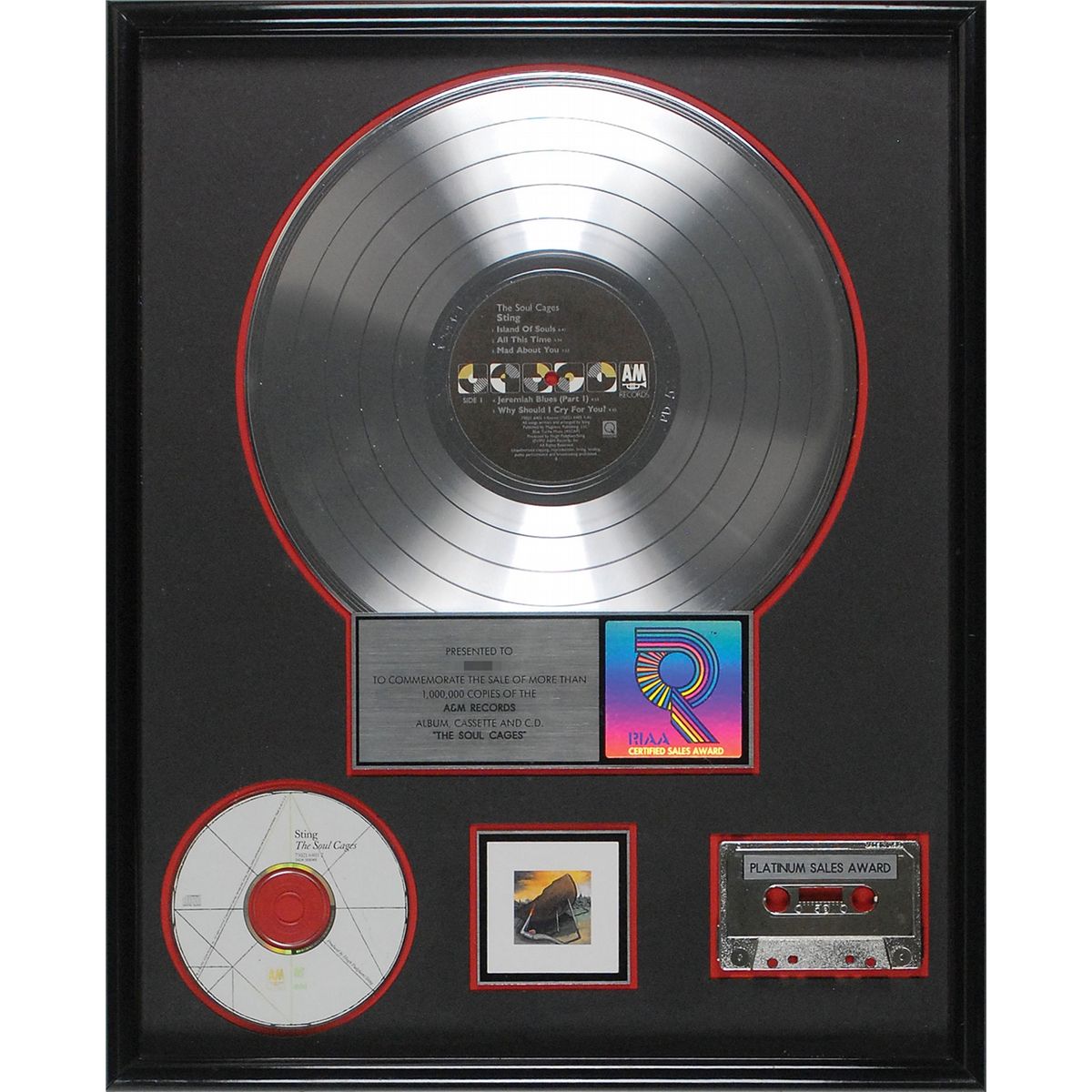 Official ‘R’ hologram-style RIAA platinum sales award commemorating the sale of more than 1,000,000 copies of the A&M Records album, cassette and C. D. ‘The Soul Cages.’ Framed with its plate, a platinum cassette, CD, and a small color reproduction of the album cover to an overall size of 17 x 21. In fine condition.