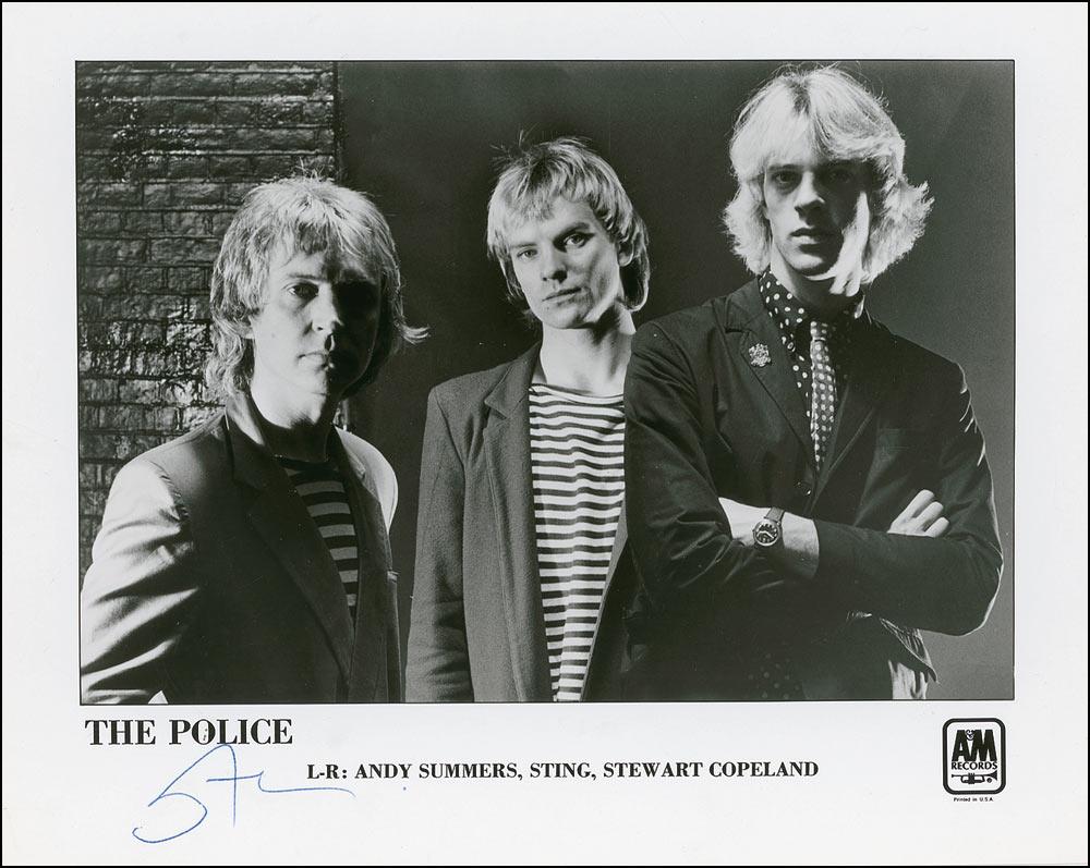 Glossy 10 x 8 A&M Records promotional photo of the Police, signed in the lower border in blue ballpoint. In fine condition, with a couple minor bends and creases.