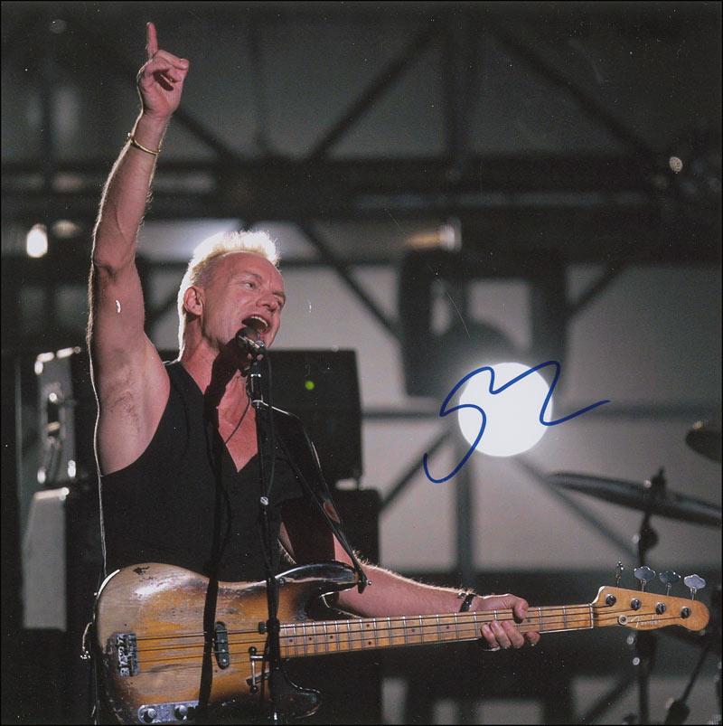 Color satin-finish 12 x 12 photo of Sting on stage with his bass, signed in blue felt tip. In fine condition.