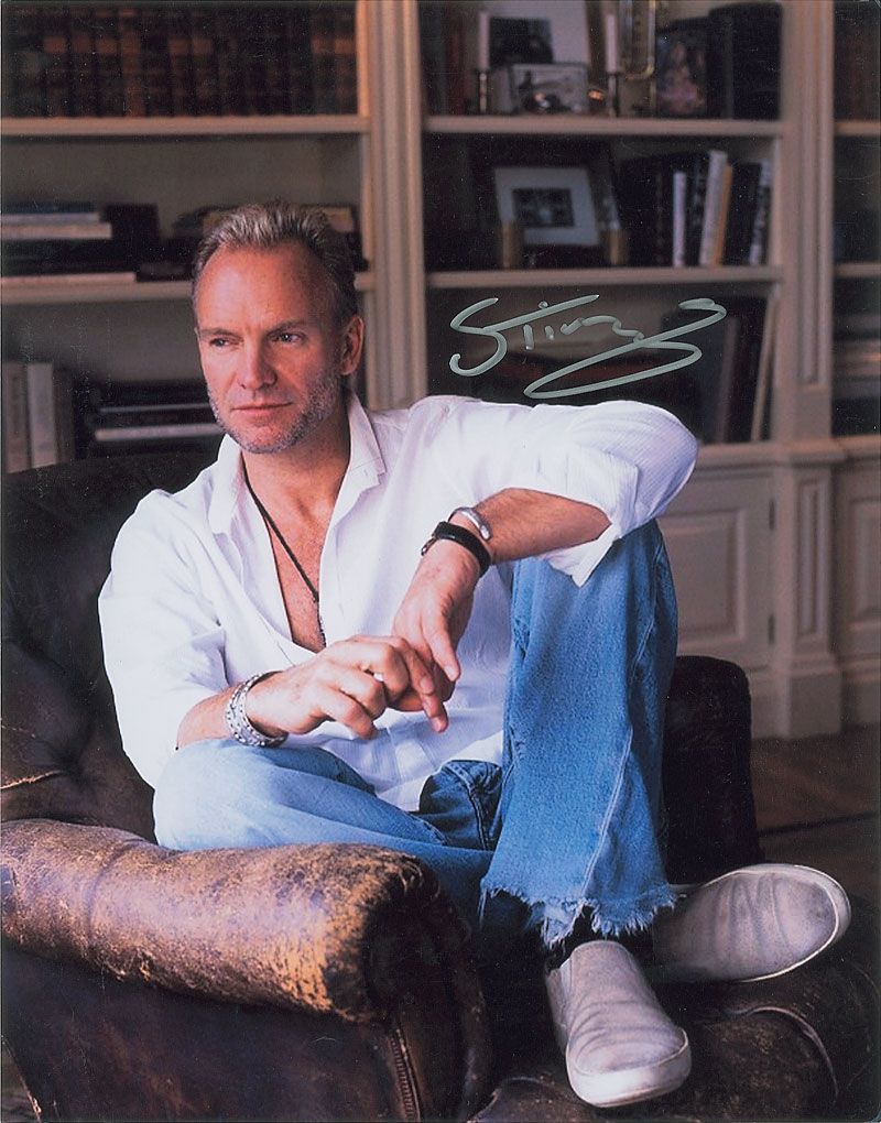 Color satin-finish 11 x 14 photo of Sting sitting in a leather chair, neatly signed in silver ink. Scattered bends and creases, otherwise fine condition.