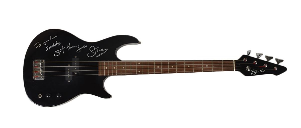 Attractive right-handed Bently black-bodied electric bass guitar, signed on the body in silver ink by Sting, who adds "If you love somebody set them free." ChromaCast gig bag is included. In fine condition.