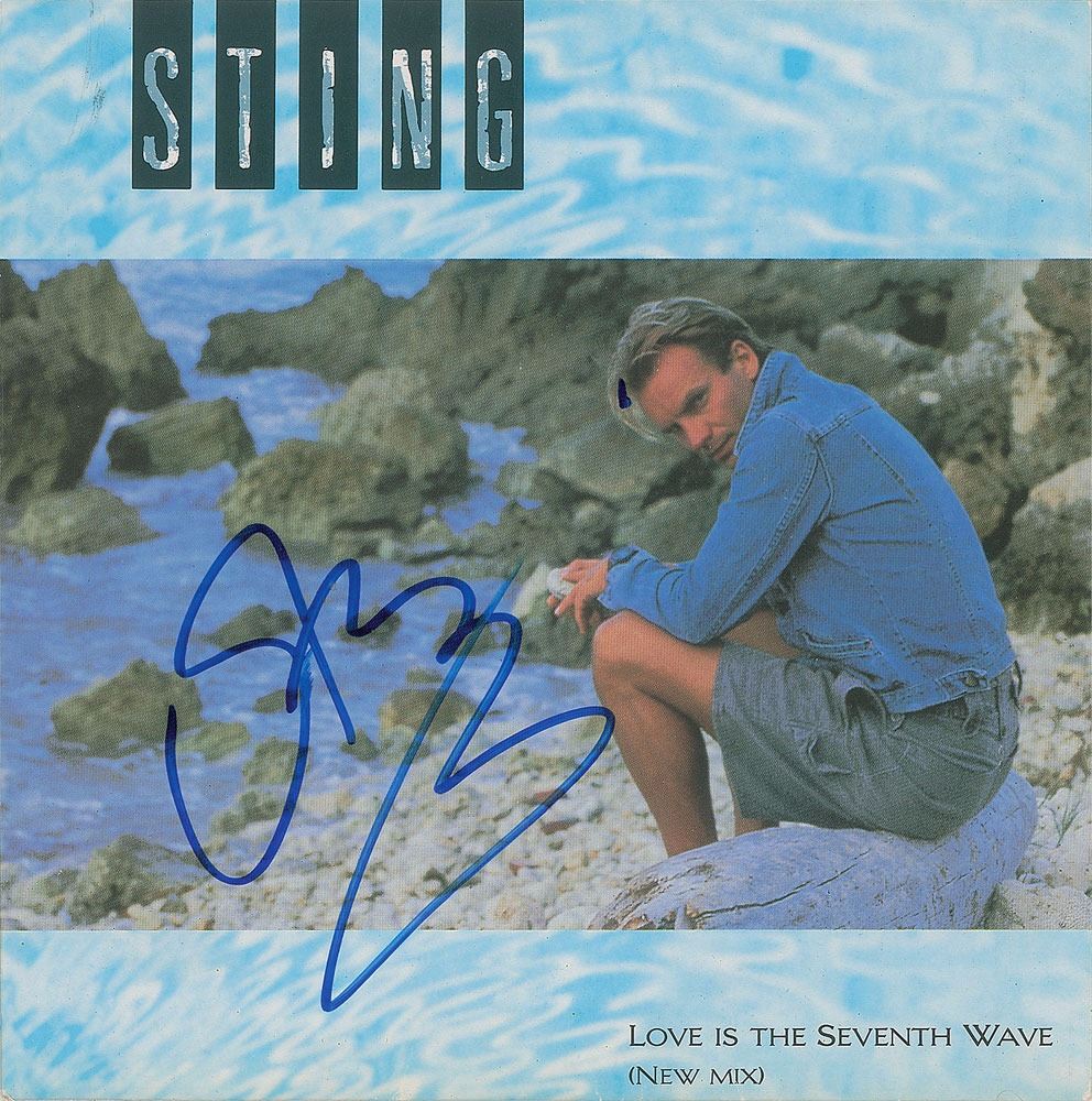 'Love Is the Seventh Wave' 45 RPM single record sleeve signed on the front in blue felt tip by Sting. In fine condition, with tape to reverse edges. The record is not included. Accompanied by a photo taken at the time of the signing.