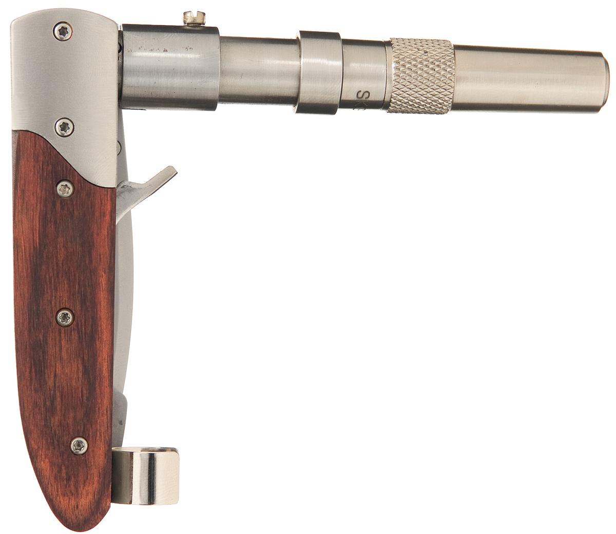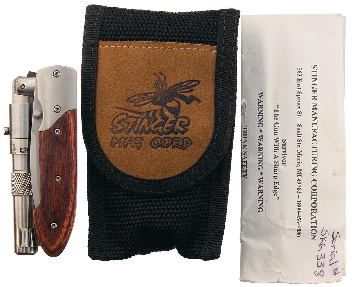 This unusual single shot .22 LR caliber pistol is concealed in a pocket knife with a single blade. The blade is 2 3/4". In the firing position, the pistol is opened to an "L" shape and it has a folding trigger. "22 LR" is marked on the barrel, with the address on the frame. Nicely figured hardwood handle slabs secured with three rivets. Complete with factory nylon carrying pouch.