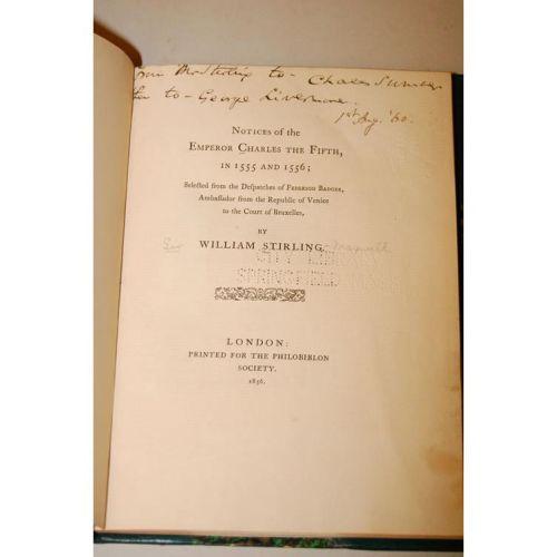 Stirling-Maxwell, Sir William. Notices of the Emperor Charles the Fifth, in 1555 and 1556; Selected from the Despatches of Federigo Badoer, Ambassador from the Republic of Venice to the Court of Bruxelles. London: Printed for the Philobiblon Scoiety, 1856. First Edition. 8vo - over 7¾" - 9¾" tall. Hard Cover. Ex-Library. Very Good Condition. LIMITED TO 25 COPIES. ASSOCIATION COPY: on title page is hand written "From Mr. Stirling to (Senator) Charles Sumner, then to (abolitionist) George Livermore. 1st Aug. '60." 58pp on laid paper, bound in 3/4 leather & marbled paper, binding & hinges tight. Library label inside cover, perforated & embossed mark on title page, perforated on Preface, embossed on pg 9, perforated on last page. Offsetting from leather salve.