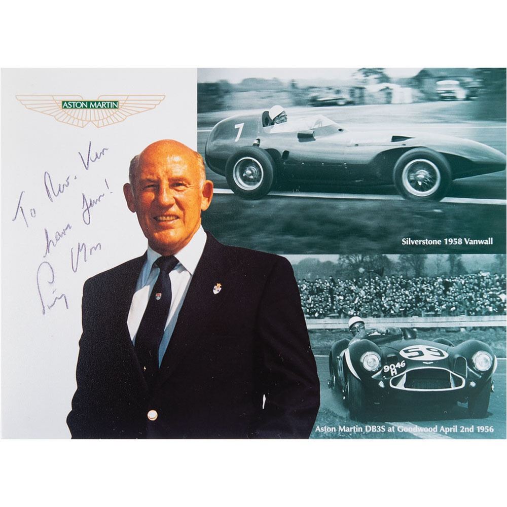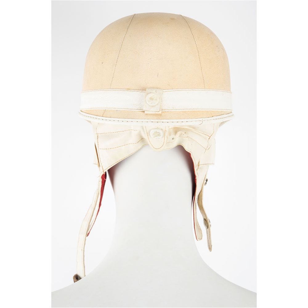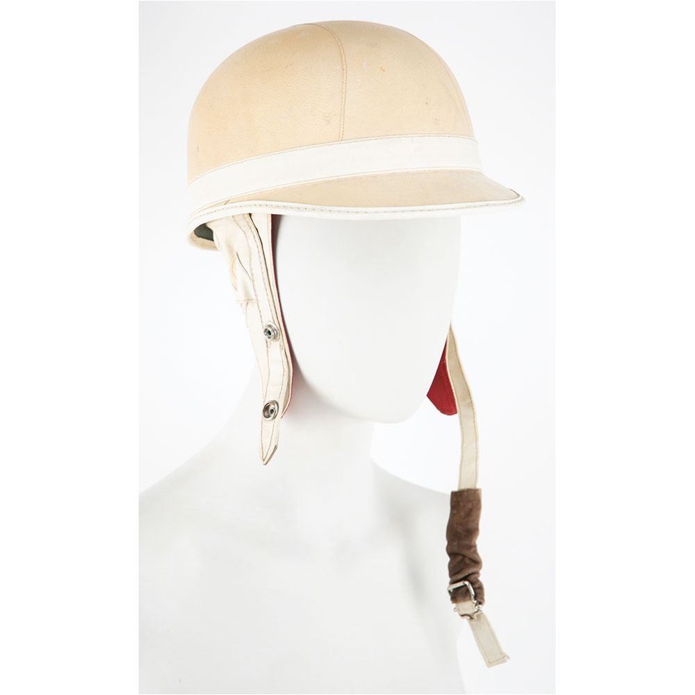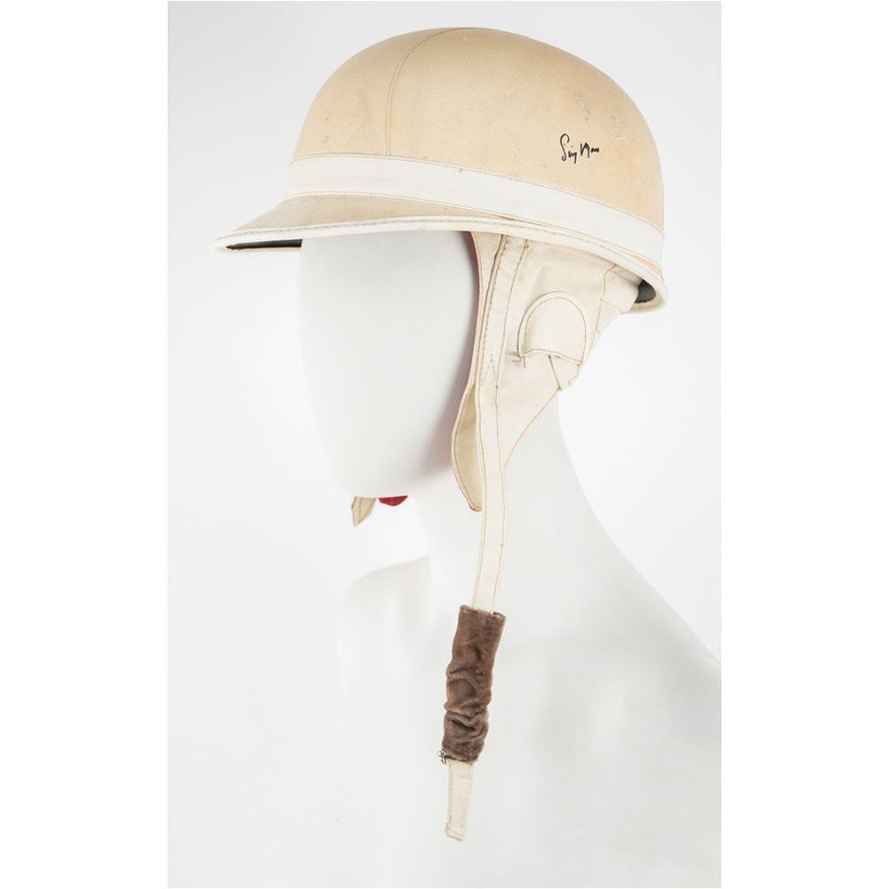 Limited edition period open face corker helmet by Everoak of England, size 7 ⅛, numbered 3/25, signed on the left side of the helmet in black felt tip by legendary British Formula One racing driver Stirling Moss. Includes a color satin-finish 5.75 x 4.25 photo of Moss posing for Aston Martin, signed and inscribed in black ballpoint, “To Rev. Ken, have fun! Stirling Moss.†In fine condition, with light soiling and scuffs to the helmet. Accompanied by a certificate of authenticity.