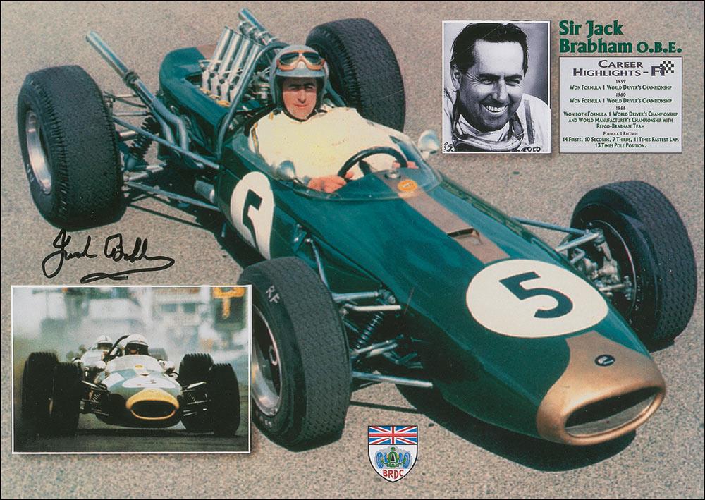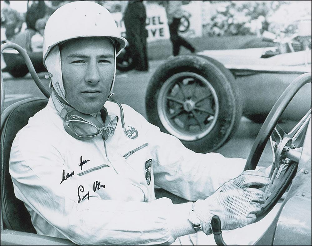 Two photos: a glossy 10 x 8 of Moss in the cockpit of his car, signed in black felt tip; and a color 11.5 x 8.25 composite cardstock photo of Brabham, also signed in black felt tip. In fine condition, with some light surface impressions to Brabham’s photo.