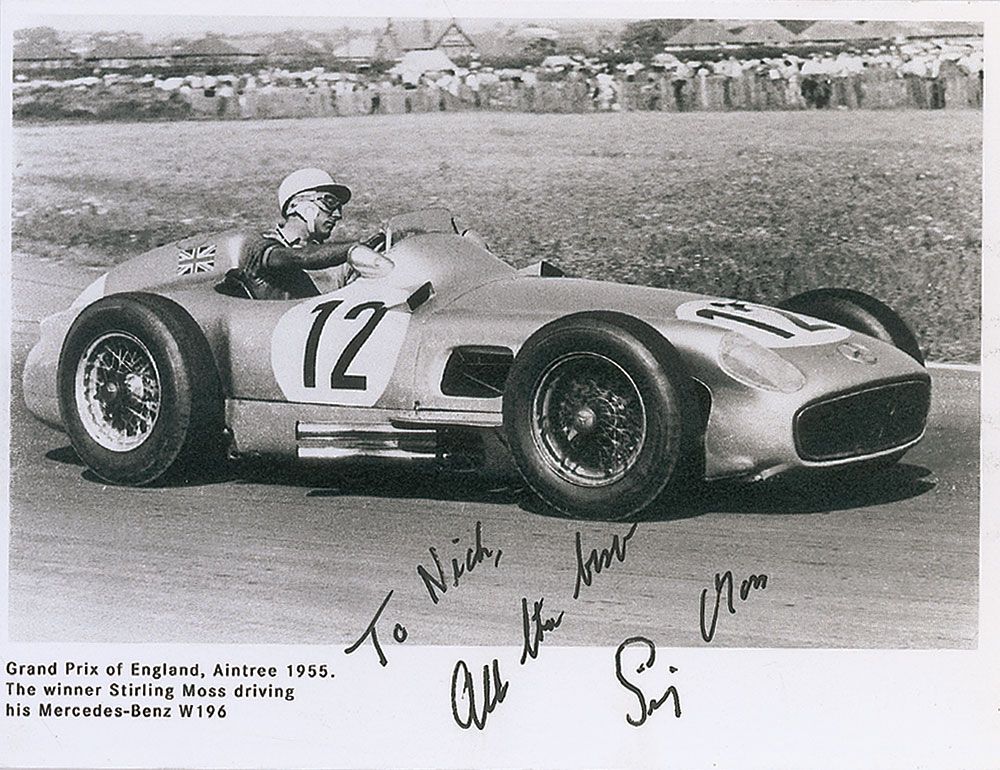 Matte-finish 5.25 x 4 photo of Moss in his car at the Grand Prix of England, signed and inscribed in black ink, “To Nick, All the best, Stirling Moss.” In fine condition, with slightly trimmed edges.