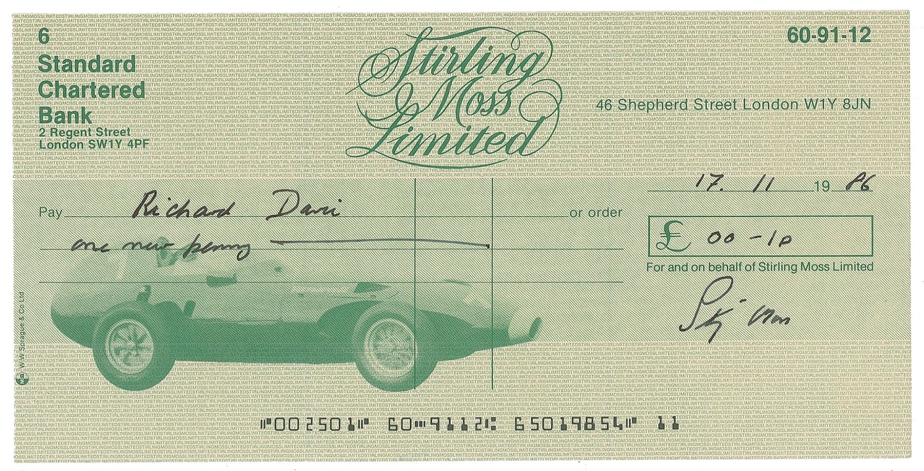 Stirling Moss Limited business check, 8 x 4, filled out and signed by Moss, "Stirling Moss," payable to Richard Davie for one pence, November 17, 1986. In fine condition.