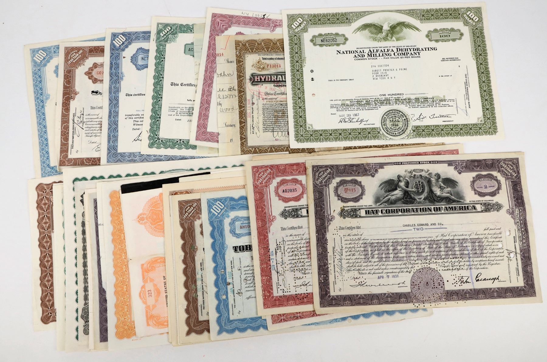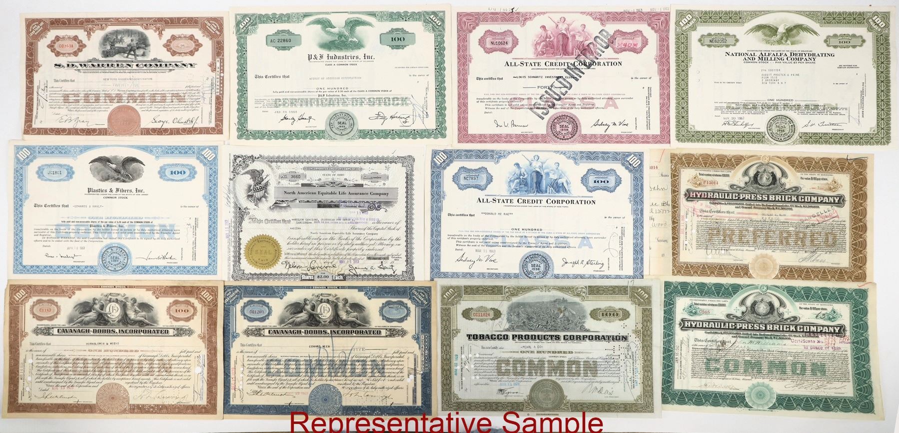 Stock Variety Group Over 100 Different Companies, Many Varieties, everything EXCEPT Mining Stocks/Railroad Stocks. Tobacco, Canals, Grocers, Cigars, Steamboats, Cruise Lines, Tea, Finance and more. Several with multiple colors and varieties. Almost all are different. See photos.