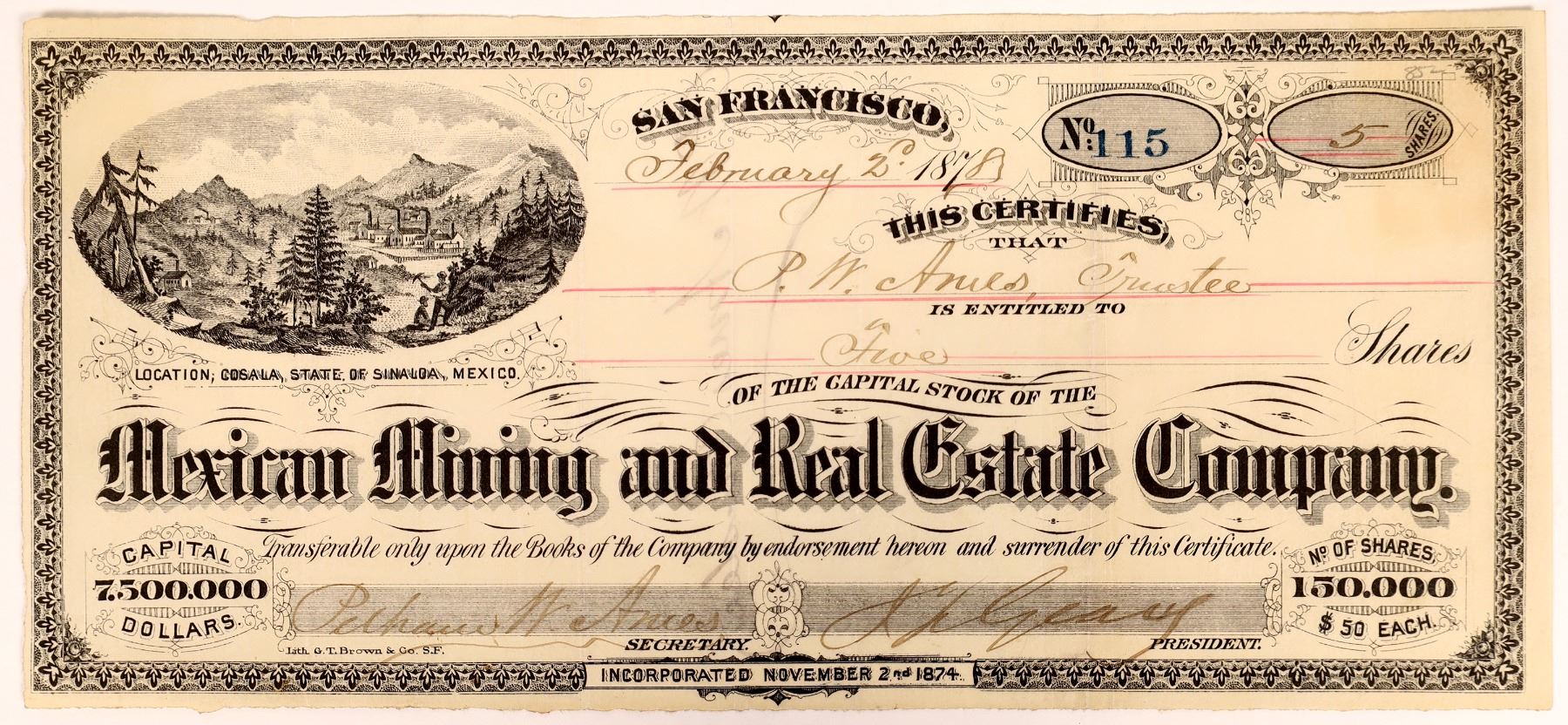 This stock certificate for the Mexican Mining and Real Estate Co. was printed by G.T. Brown of S. F. dated Feb. 2, 1878 to a P.W. Ames trustee and secratary, and also signed by J. Geary President of the company. A beautiful mining vignette in the left corner.