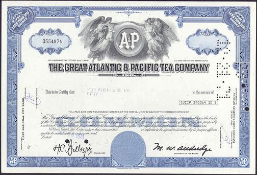 Stock Certificate from the Great Atlantic & Pacific Tea **|**|** Vintage 12" wide stock certificate from The Great Atlantic and Pacific Tea Company (A & P). The dates vary on these, but they are all from the early 1970s. They have been used but are in excellent well preserved condition. These are really nice.