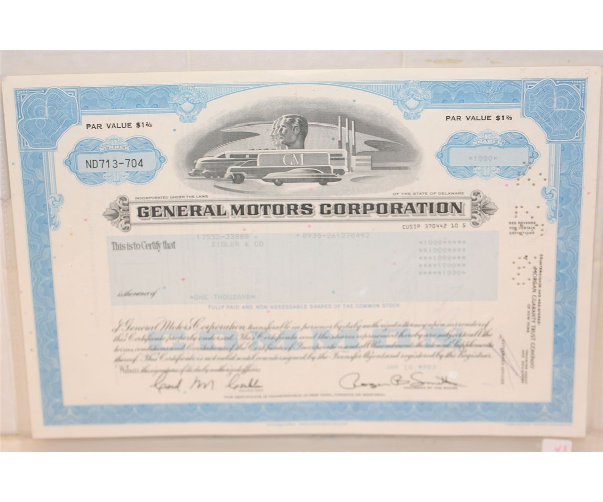 This lot is a stock certificate from general motors corporation state of delaware for 1000 shares dated january 18, 1983