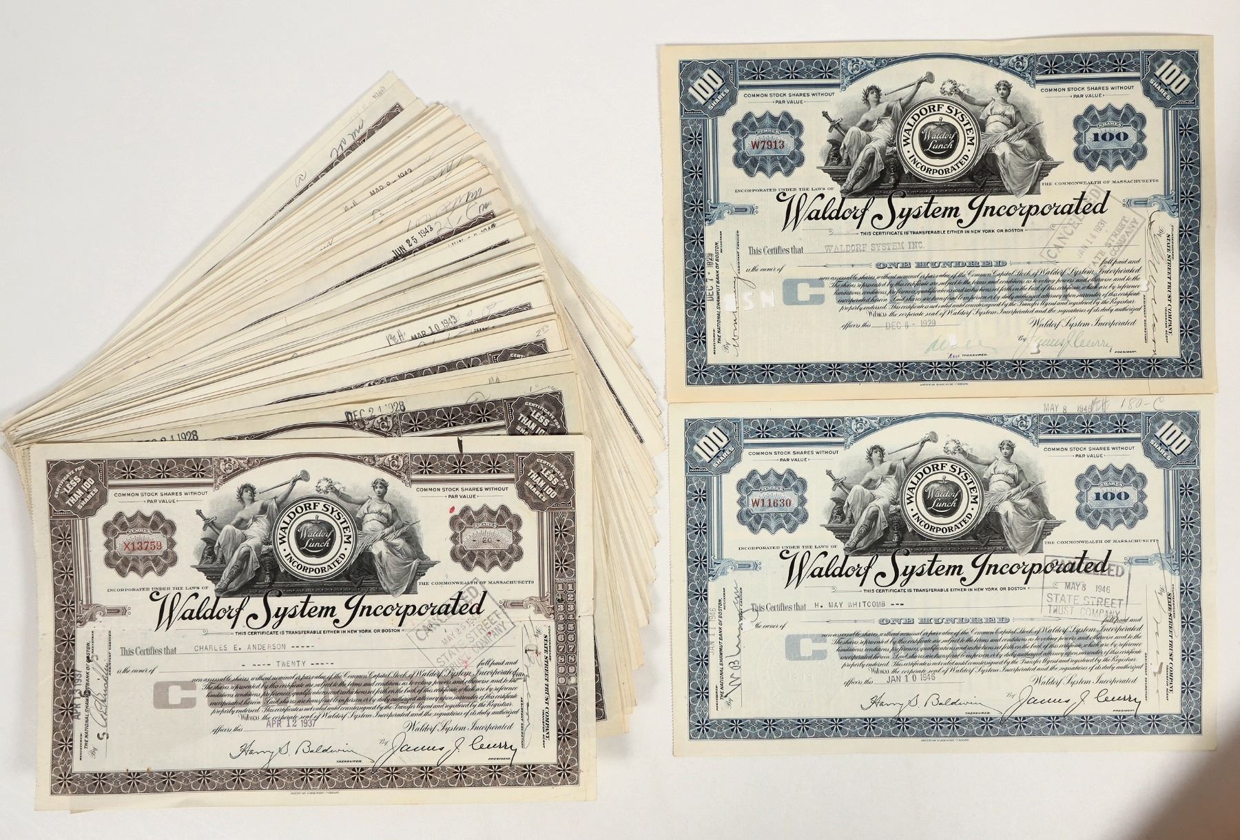 This is a lot of Waldorf Systems Inc. of Massachusetts. An estimated 70 plus certificates. Issued between 1925-1945. Waldorf Systems was cafeteria company.