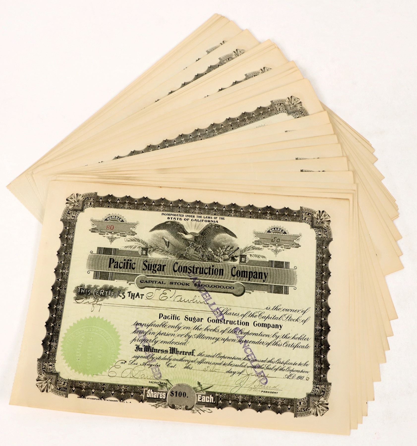 This is a group of stocks for the Pacific Sugar Construction Company. Seven were issued in 1906; the rest are unissued. Please see photo for details.