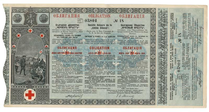 1912, Sofia. Stock certificate printed in French and two other languages. Blue, black and red with blue underprinting. Numerous “Red Crosses” printed on the certificate. Litho. On left vignette of paramedics bringing a wounded soldier to tent as Red Cross workers administer first aid to an injured victim. Litho. Uncancelled and very fine condition.