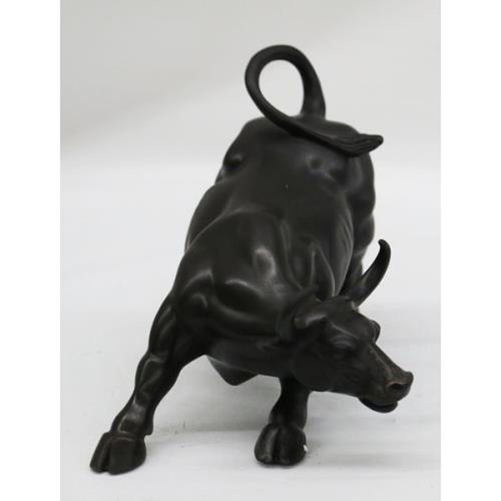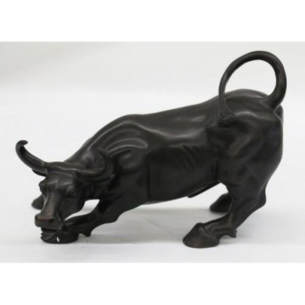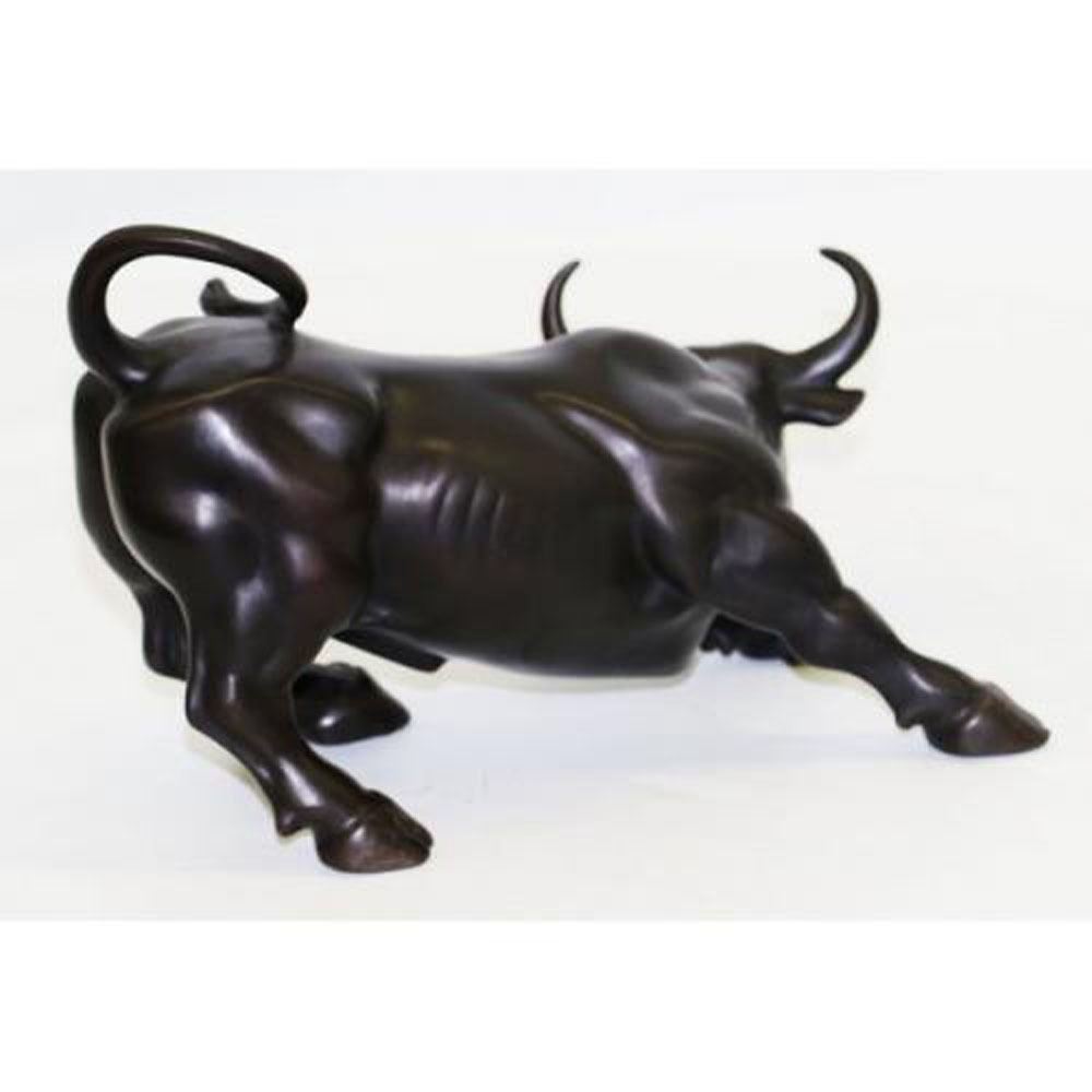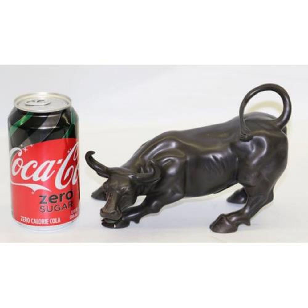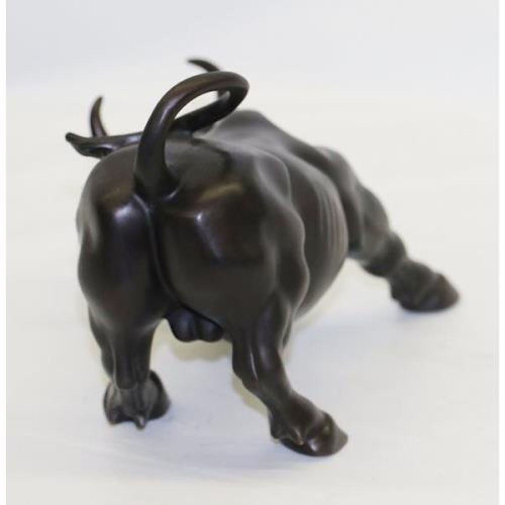 Bulls are much more muscular than cows, with thicker bones, larger feet, a very muscular neck, and a large, bony head with protective ridges over the eyes. These features assist bulls in fighting for domination over a herd, giving the winner superior access to cows for reproduction. The hair is generally shorter on the body, but on the neck and head, there is often a mane of curlier, woolly hair. Bulls are usually about the same height as cows or a little taller, but because of the additional muscle and bone they often weigh far more. This bull is leaning his head a little down and he is eating greens off the floor. This sculpture was cast using the ancient old Lost Wax Method stained in brown patina finish for preservation. Bronze Dimensions: Height 5 X Width 9 Inches. Weight: 4 LBS.