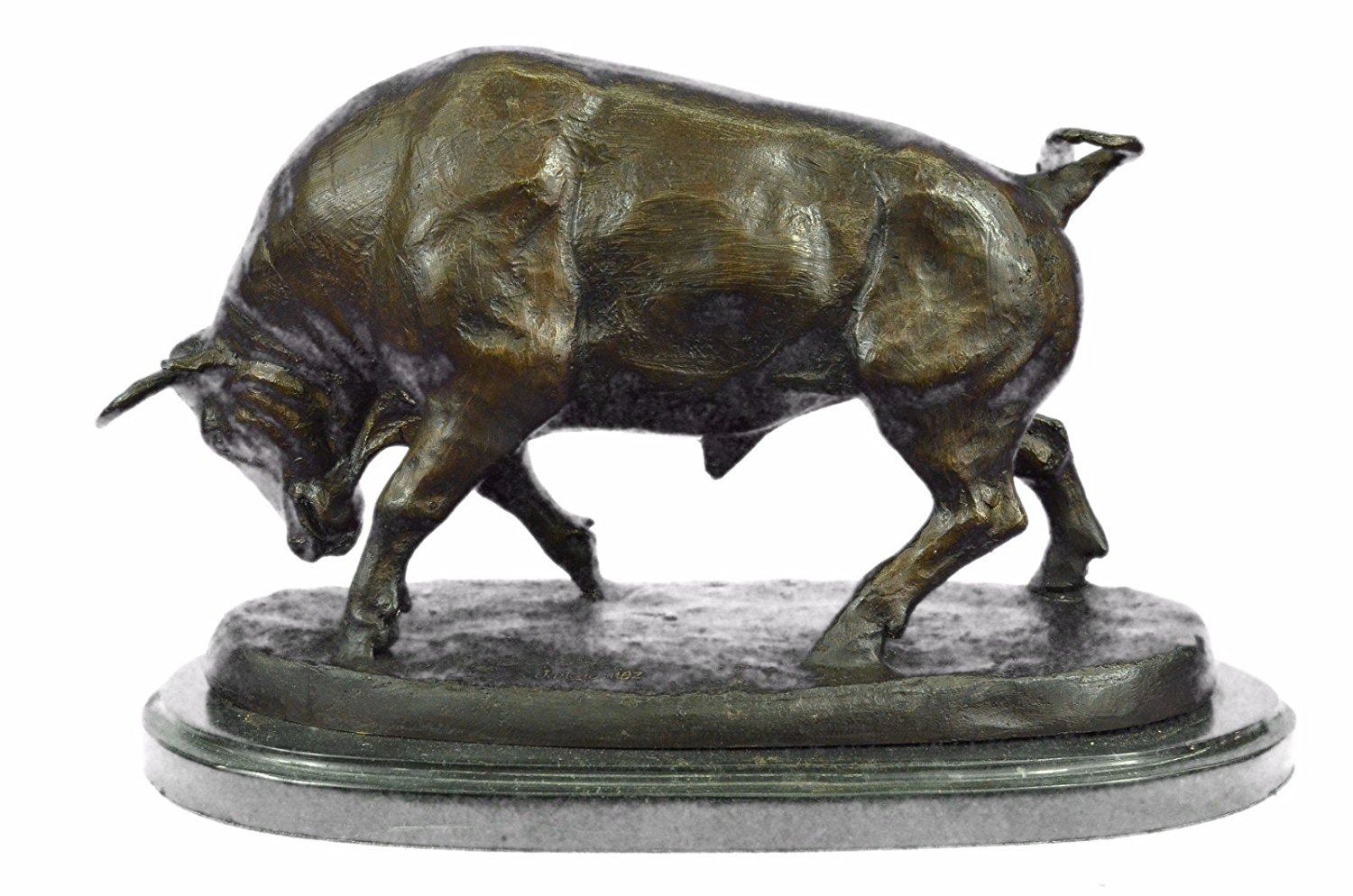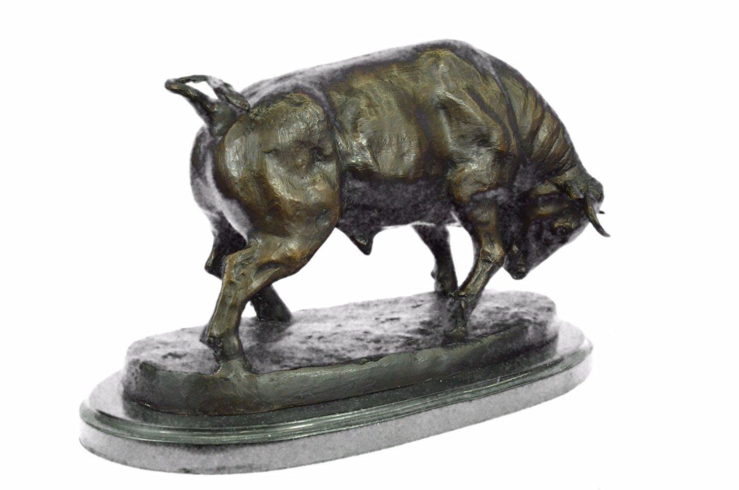 This magnificent sculpture is of a charging bull. With his head down, his nostrils' flared and his muscles tightened he stomps the ground before him, releasing a vibrating grunt, he smells the ground before him. All he see's now is red and he is raging angry, his horns are sharp and solid and he prepares to charge his nemesis and take him down. He is an extremely muscular and dense creature, thick rolls of muscle and fat around his neck for protection, he was made for these sorts of confrontations of physical strength. His tail curls up in a swift motion and off he goes, frozen in his pose and replicated in a true masterpiece of bronze artwork. Handmade of 100% bronze and resting on a solid black marble base this sculpture has a two tone brown patina and is cast using the ancient Lost Wax Method. Bronze Dimensions with Marble Base: Height 11 X Width 17 inches. Weight: 35 LBS. Inventory: 68545955786