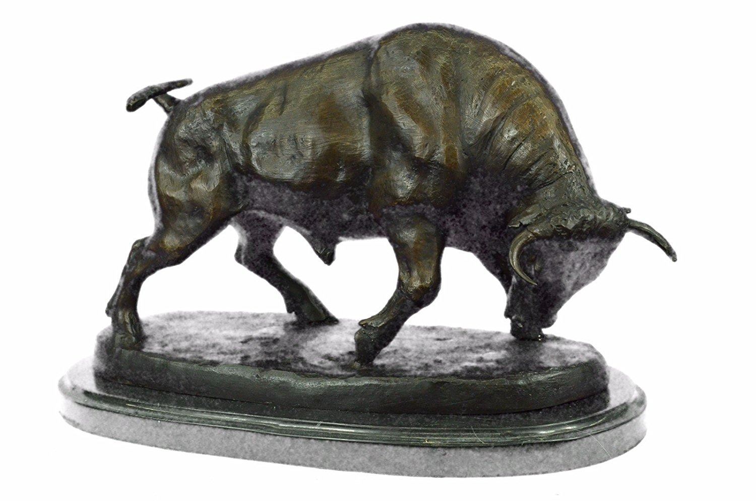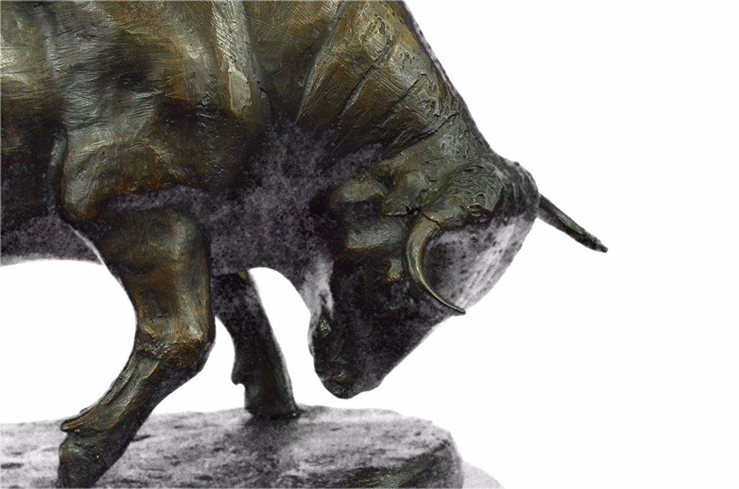 This magnificent sculpture is of a charging bull. With his head down, his nostrils' flared and his muscles tightened he stomps the ground before him, releasing a vibrating grunt, he smells the ground before him. All he see's now is red and he is raging angry, his horns are sharp and solid and he prepares to charge his nemesis and take him down. He is an extremely muscular and dense creature, thick rolls of muscle and fat around his neck for protection, he was made for these sorts of confrontations of physical strength. His tail curls up in a swift motion and off he goes, frozen in his pose and replicated in a true masterpiece of bronze artwork. Handmade of 100% bronze and resting on a solid black marble base this sculpture has a two tone brown patina and is cast using the ancient Lost Wax Method. Bronze Dimensions with Marble Base: Height 11 X Width 17 inches. Weight: 35 LBS. Inventory: 68545955786