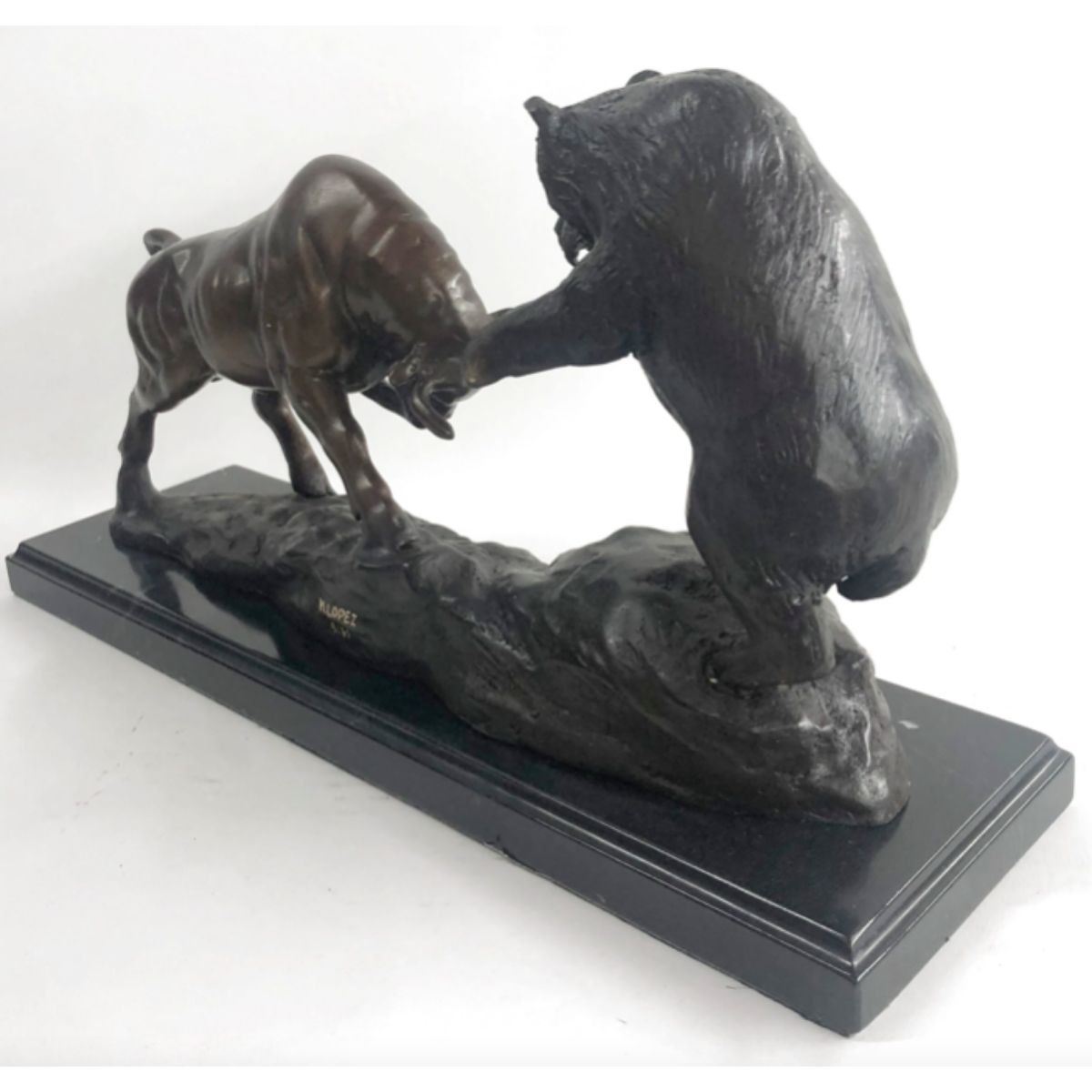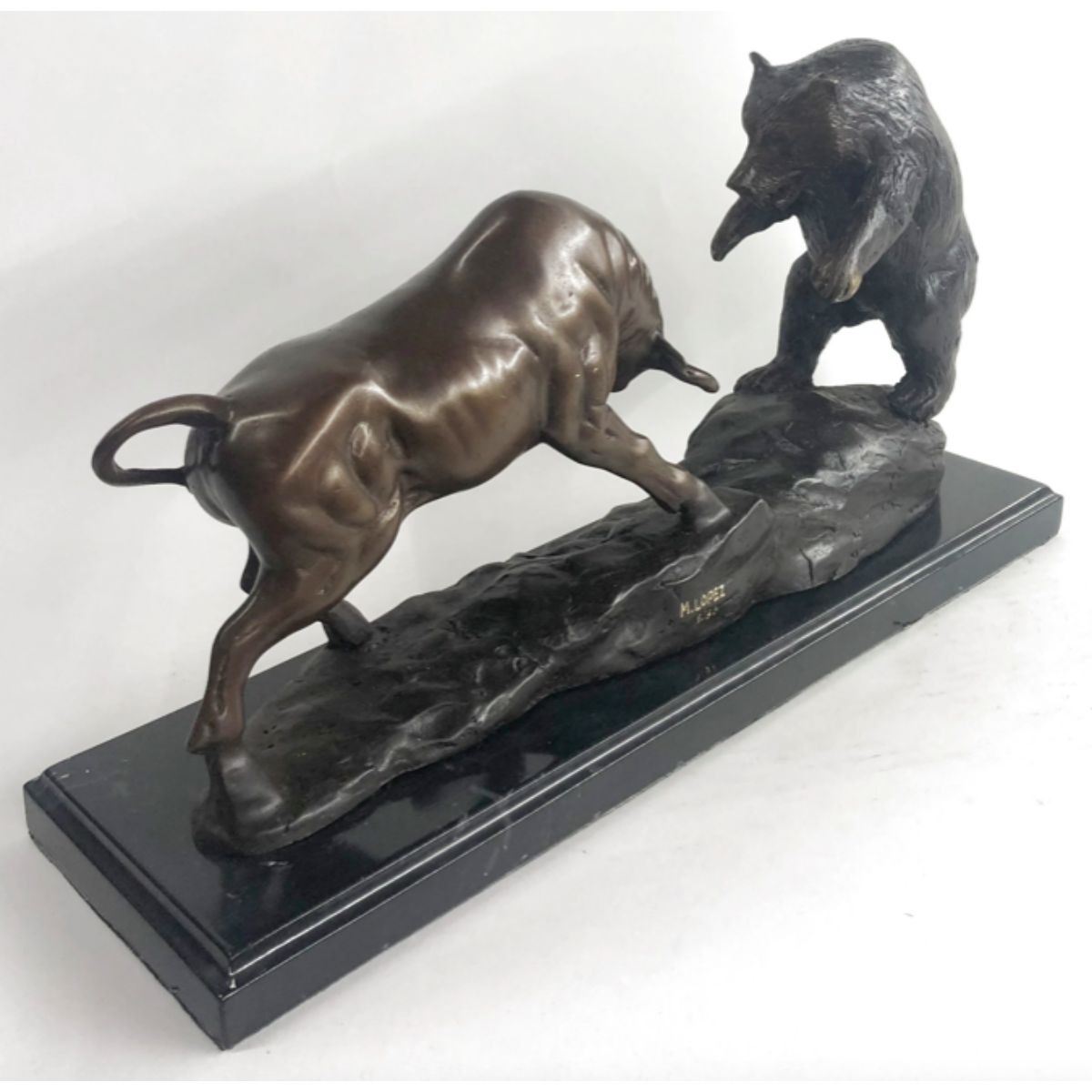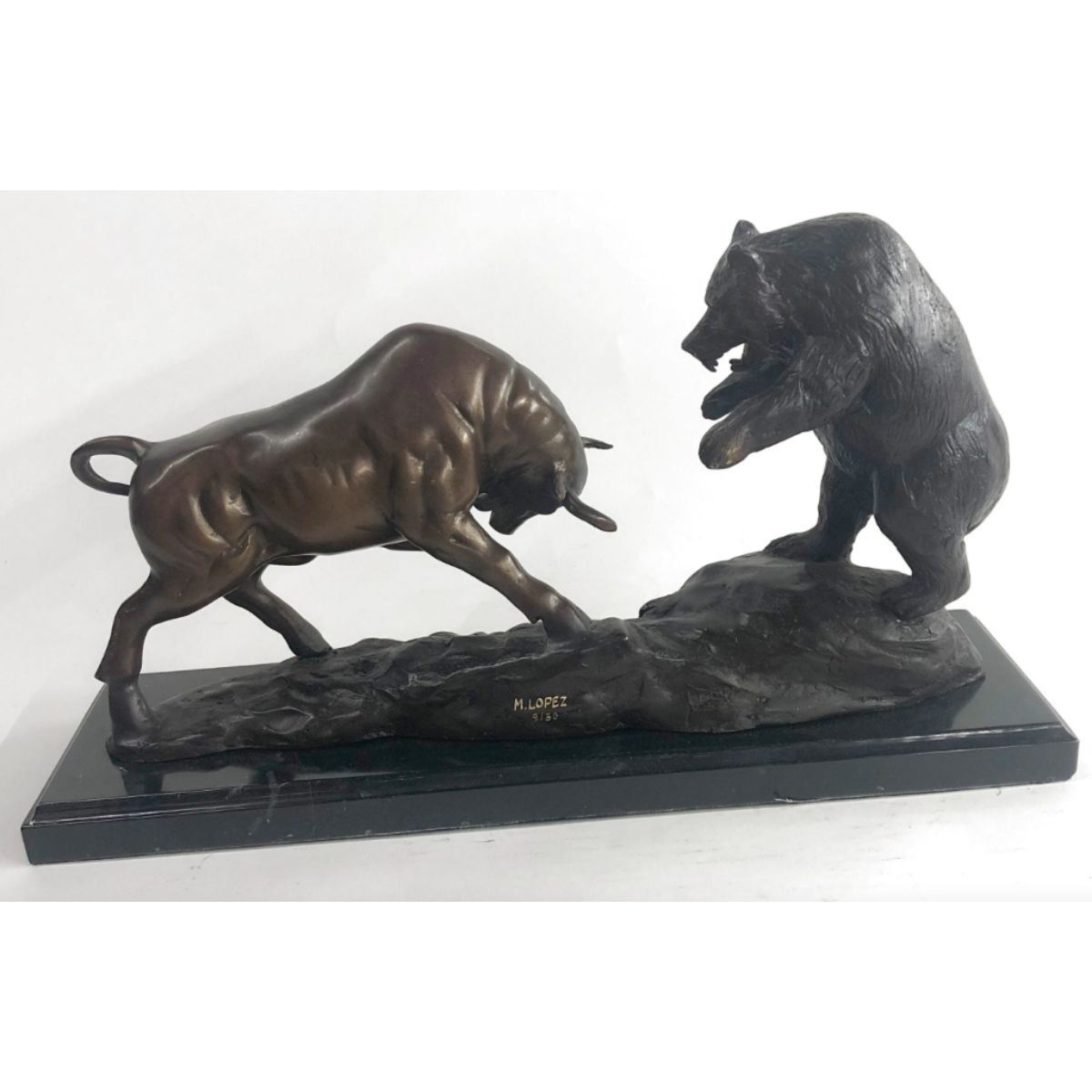 Stock Market Bull Vs Bear Signed Sculpture. Lost wax casting method bronze, with brown patina, mounted on a marble base. Signed by the artist, Miguel Lopez, at base. 9 1/2" H X 17" W. 18lbs.