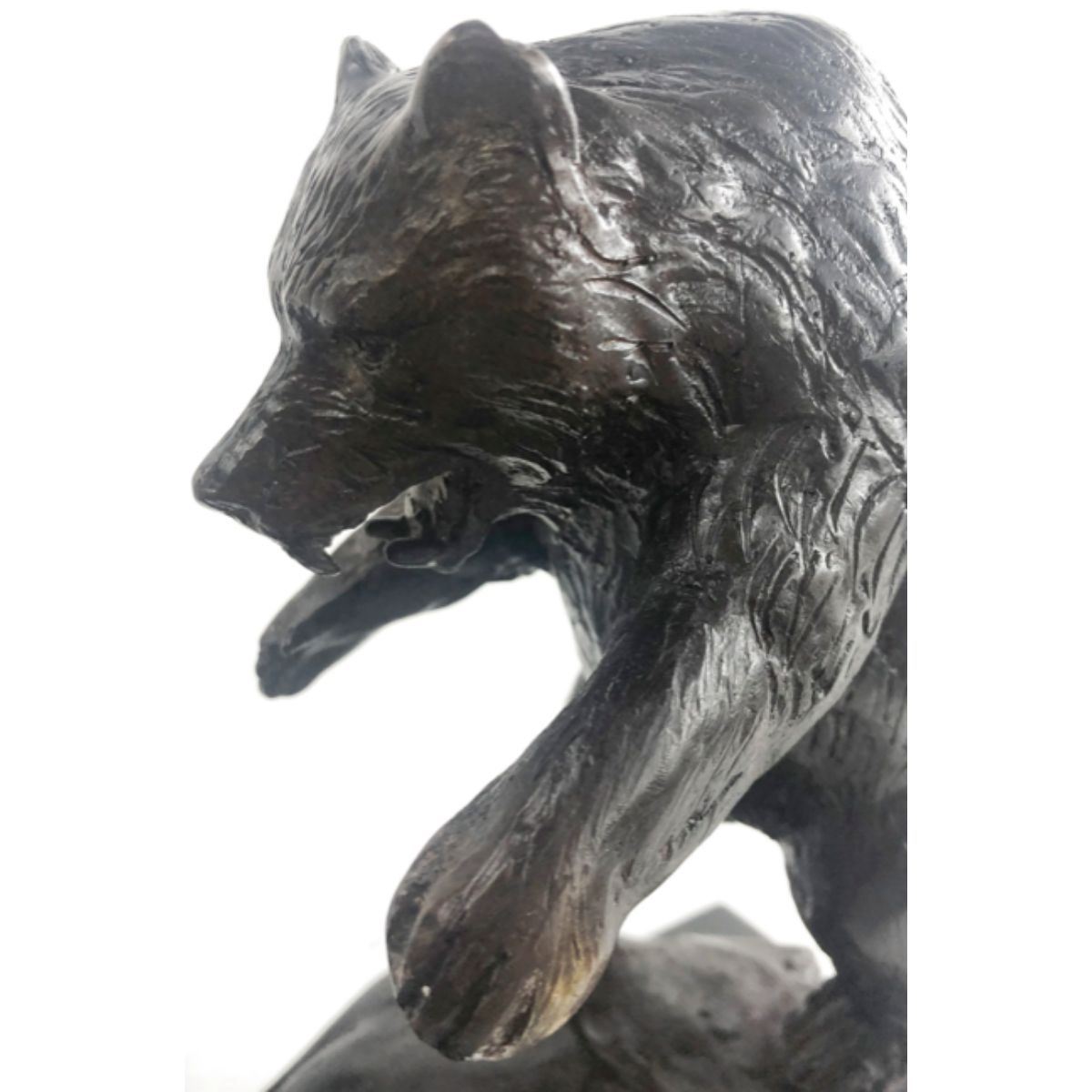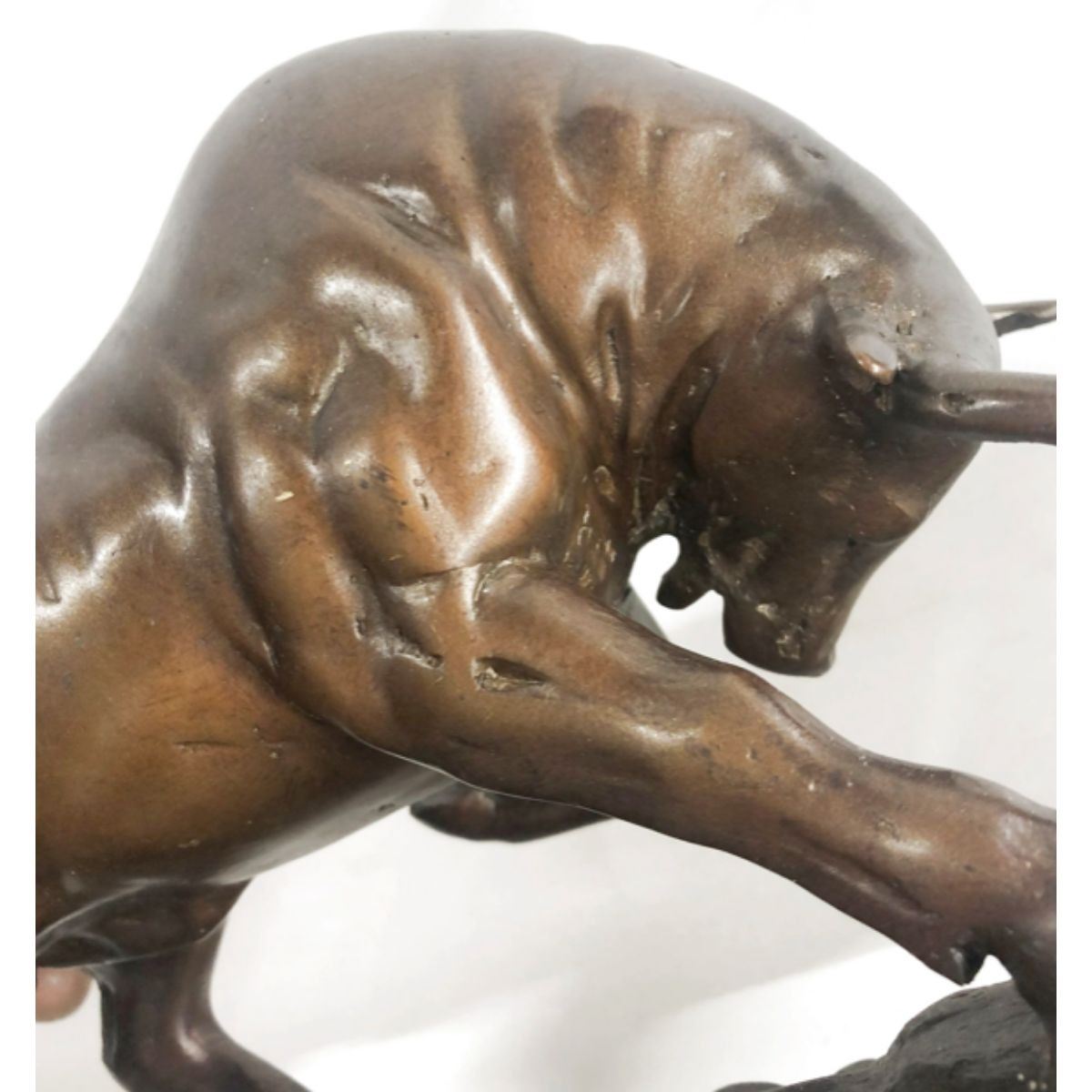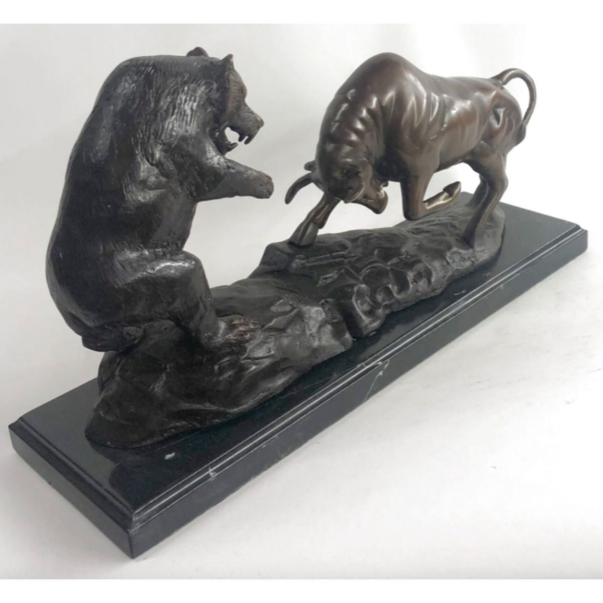 Stock Market Bull Vs Bear Signed Sculpture. Lost wax casting method bronze, with brown patina, mounted on a marble base. Signed by the artist, Miguel Lopez, at base. 9 1/2" H X 17" W. 18lbs.
