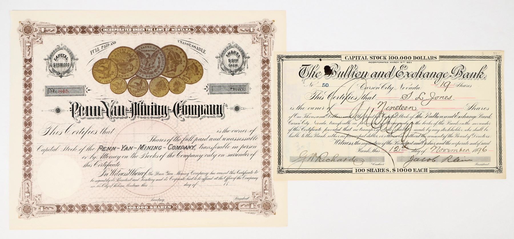 Lot of 2 different. 1) Bullion & Exchange Bank, Carson City, Nevada. Issued in 1896. Signed by Jacob Klein as president and cashier Richards. Pen cancelled. 2) Penn Yan Mining Company. Unissued. Montana. Fantastic vignettes of coin obverses and reverses.