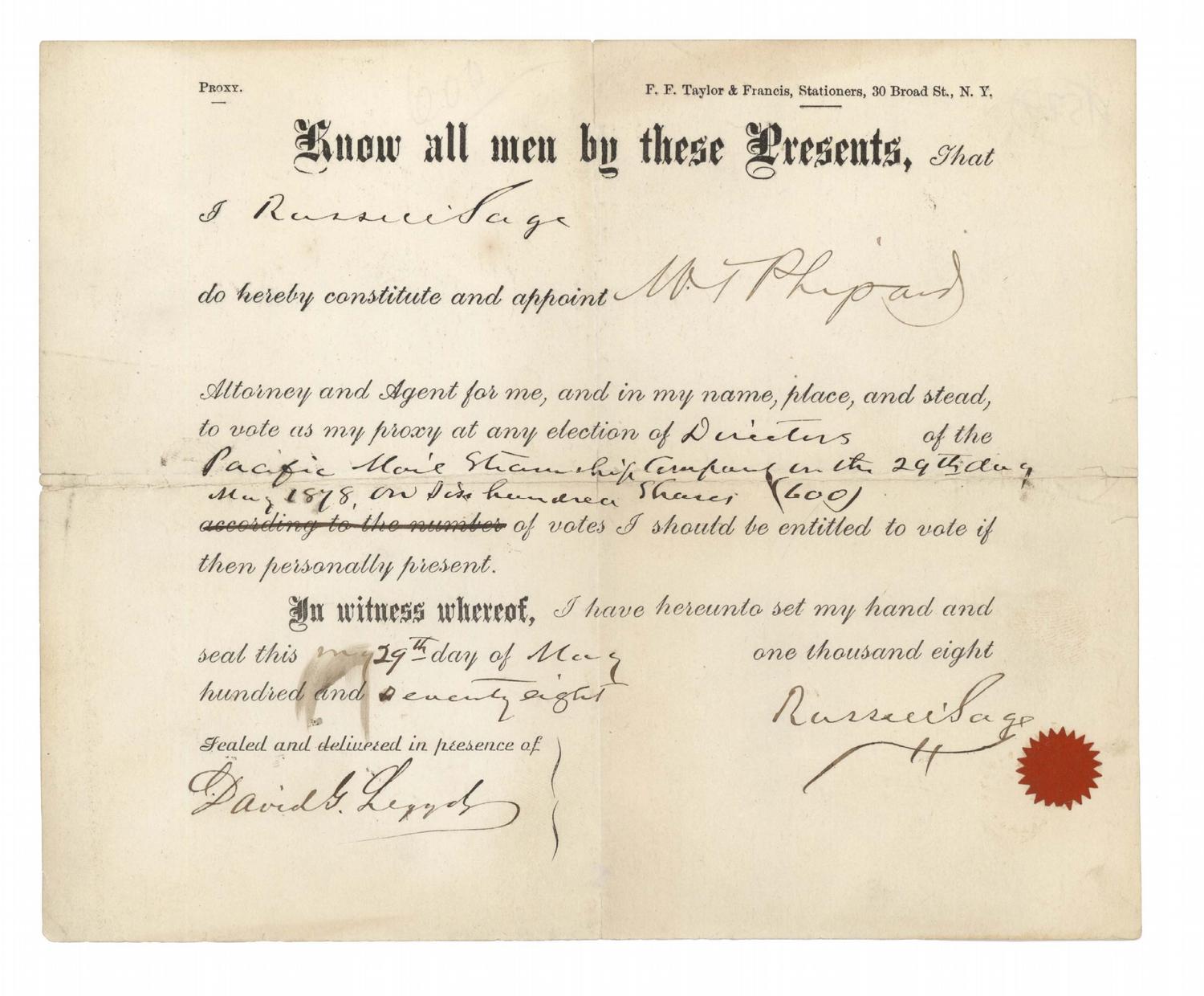 1878. Partially Printed Stock Proxy Signed by RUSSELL SAGE [(1816-1906). Banker; Financier; U.S. Congressman.] With red seal affixed. Very Fine As the originator of ""put and call options"", Russell Sage greatly changed the way speculators played the stock market. Among America's most powerful and wealthy bankers, he financed Jay Gould and made a vast fortune on the latter's stock manipulations. According to the Dictionary of American Biography, ""Sage was one of the shrewdest and most conservative of all great financiers."" Founded in 1848 as a joint stock company by a group of New York City merchants, the Pacific Mail Steamship Company, which would later become a charter member of the Dow Jones Transportation Average, met with booming business from its inception due to the discovery of gold in California. Playing a key role in the transportation of people and goods, the company proved instrumental in the growth of San Francisco. In 1867, the company launched the first regularly scheduled trans-Pacific steamship service with a route running from San Francisco to Hong Kong and Yokohama. Eventually extending service to Shanghai, the route further diversified California by bringing in an influx of Japanese and Chinese immigrants to that state. A fine association of an individual and company that proved instrumental to the financial and business history of American and the world.