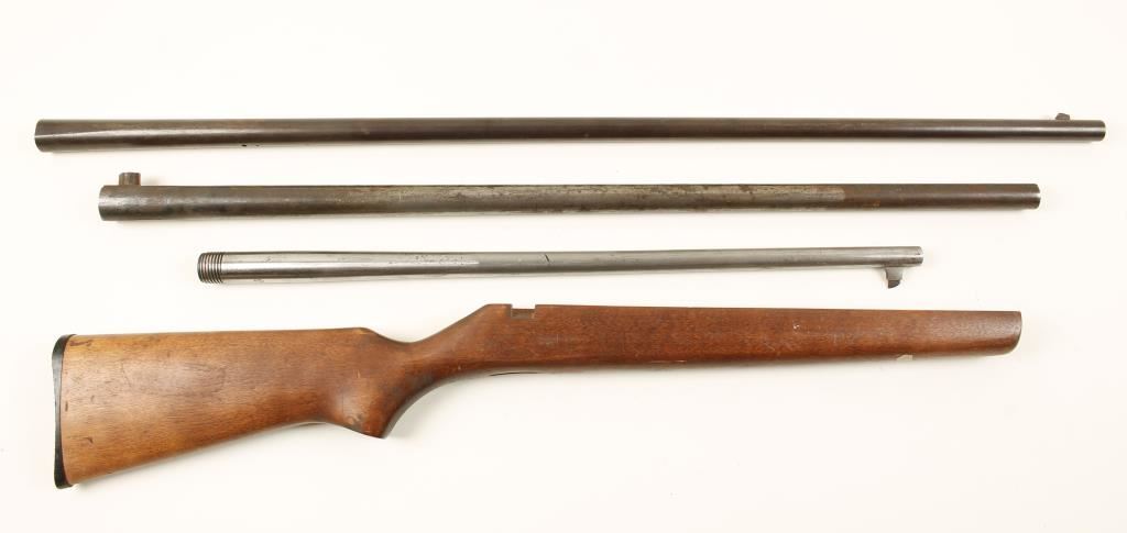 By the butt plate this stock appears to be for a Marlin bolt-action single-shot rifle with a bull barrel or a bolt-action shotgun.. None of the barrels are marked. The one that's in-the-white has an extractor cut on the top of the chamber and acme threads. The 22" bore is frosty with rifling. The other two are for muzzle loaders and are threaded in the breech for the plug on one and the flash-hole/plug on the other. The one with the front sight is 34.5" long and the other is 29.25" long. The long one has a bright shiny bore with rifling and the other is a cave of despair with heavy pitting and some rifling. The long barrel has a plum/brown exterior with some surface rust. The short one has turned to brown or gone to bare metal with surface rust and some deep pitting.