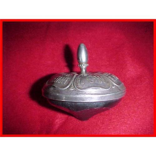 This unmarked old 2-1/2" tall silver metal(Looks-like silverplated) and early plastic toy top has tasks for a stock broker printed on the top's top surface.The tasks are "Sell High","Work","Leave Early","Buy Low","Hire Assistant" and "Play Golf". A person spins the toy top and the top tells the person what task to do that moment. Good condition with slight scuffing and denting from being used. Exact age and origin is unknown. A great gift for a stockbroker.