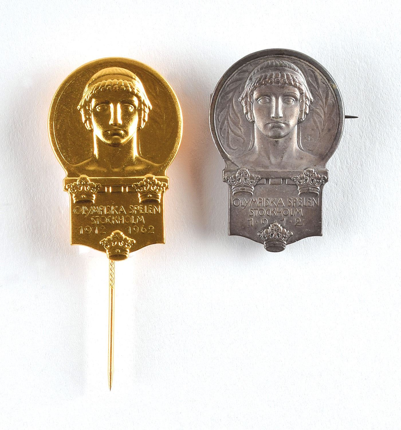 Competitor's badge and stickpin issued for the Stockholm 1912 Summer Olympics: an official silvered competitor’s participation badge depicting an ancient Greek athlete’s head, 25 mm x 37 mm, reading, “Olympiska Spellen, Stockholm, 1912”; and a matching gilt badge on a stickpin depicting an ancient Greek athlete’s head, 25 mm x 37 mm, reading, “Olympiska Spellen, Stockholm, 1912." The silvered badge is stamped on the reverse with a Sporrong & Co., Stockholm, maker’s mark.